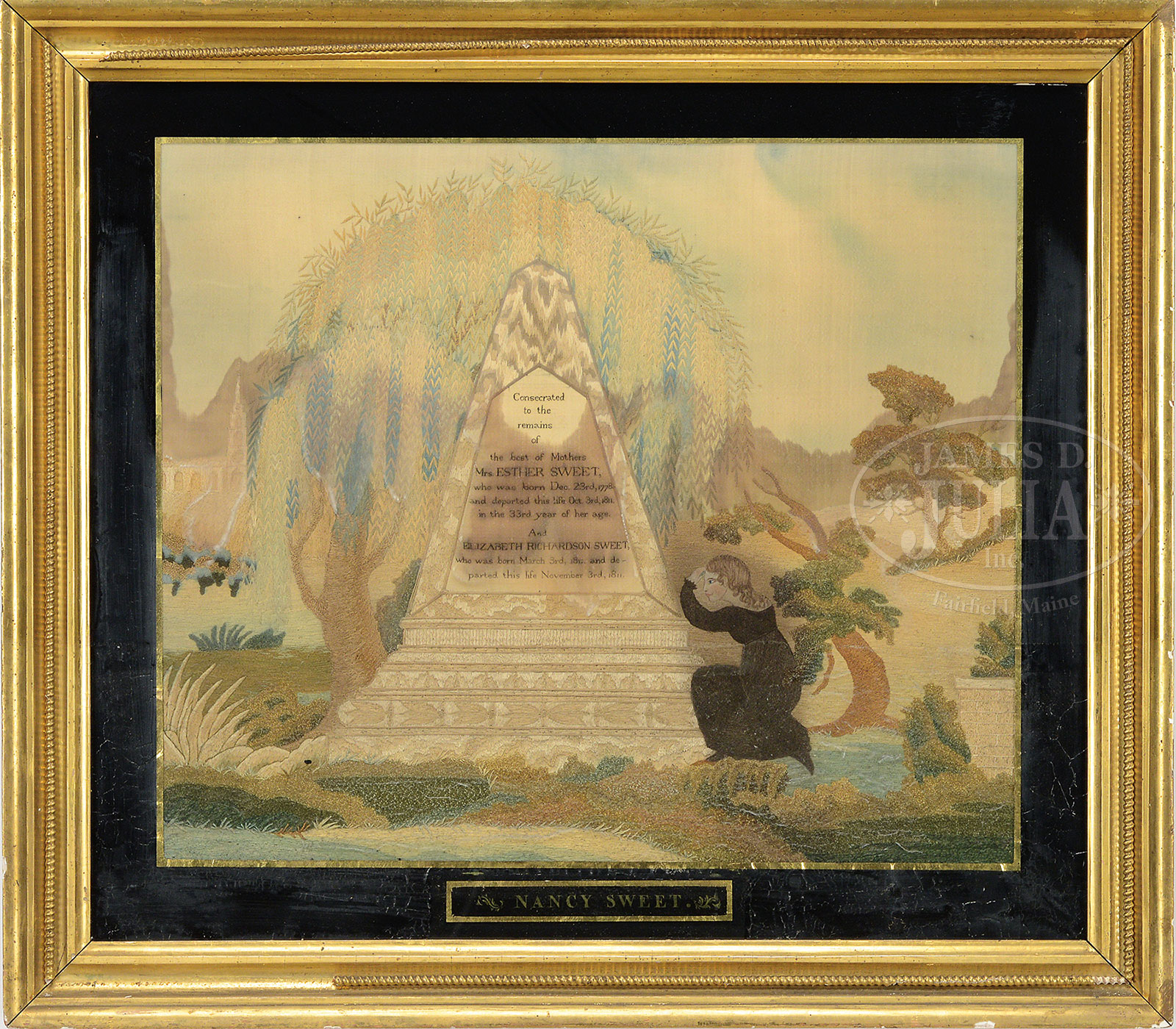 NEEDLEWORK MEMORIAL TO MRS. ESTHER SWEET BY HER DAUGHTER NANCY SWEET.The needlework has a central obelisk type monument with willow tree and grieving girl. A church is seen on the left side in a landscaped foreground. The monument has black stitch inscription “Consecrated to the remains of the best of Mother’s. Mrs Esther Sweet, who was born Dec. 23rd, 1778 and departed this life Oct. 3rd, 1811. In the 33rd year of her age and Elizabeth Richardson Sweet, who was born March 3rd, 1811 and departed this life November 3rd, 1811”. Housed in a lemon gold gilt wood frame with glass having a black border with “Nancy Sweet” at bottom. SIZE: Sight: 20″ x 23-1/2″. Overall 24″ x 27-1/4″. CONDITION: There is some staining on the glass underneath with water stains to monument and across needlework. Stitching and background are intact. 52000-2 (800-1,200) – Lot 2278