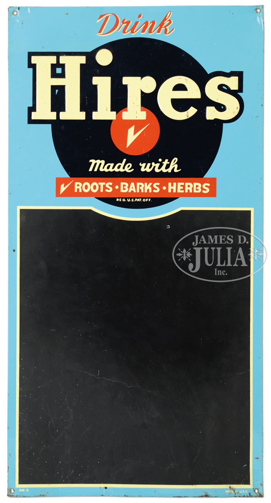 LOT OF 17 HIRES ROOT BEER ADVERTISING ITEMS.1) Hires 1940s tin sign captioned “With Real Root Juices”. 2) Hires 1930s tin sign captioned “Drink Hires in Bottles”. 3) Hires 1850s T.O.C. signed captioned “Real Old Time Here”. 4) Hires 1950s round tin sign. 5) Circa 1950s Hires oval cardboard die cut sign. 6) Hires 1940s round cardboard die cut with young woman. 7) Hires 1949 tin sign captioned “Have a Hires and Refresh”. 8) Hires 1940s embossed tin sign captioned “A Toast to Good Taste”. 9) Hires 1930s tacker embossed tin sign captioned “Healthful/Delicious”. 10) Hires figural bottle thermometer. 11) Hires embossed tin sign with bottle and sandwich. 12) Hires round 3-D tin sign. 13) Hires oval brass oak barrel sign that reads “Drink Hires – 5C”. 14) Hires 1950s embossed tin menu board. 15) Hires 1940s embossed tin sign captioned “It Tastes So Good”. 16) Hires 1940s embossed tin sign captioned “For Pleasure and Thirst”. 17) Hires 1940s menu board captioned “Made With Roots-Barks-Herbs”. SIZE: 1) 11-3/4″ w x 7″ h. 2) 13-3/4″ x 4-3/4″. 3) 8″ x 10″. 4) 12″ dia. 5) 13-3/4″ w x 9-1/2″ h. 6) 12″ dia. 7) 26-3/4″ w 9-1/4″ h. 8) 19-1/4″ x 13-1/4″. 9) 27-1/2″ x 9-1/2″. 10) 7-3/4″ x 28-1/2″. 11) 14″ x 19-1/4″. 12) 13-1/4″ dia. 13) 9-3/4″ x 4″. 14) 19-1/4″ x 29-3/4″. 15) 14″ x 47″. 16) 56″ w x 17-1/2″ h. 17) 15-1/2″ w x 29-1/2″ h. CONDITION: 1) Good to very good with nail holes to top corners and scattered scrapes. 2) Good to very good with some light creasing and surface scuffs. 3) Very good to excellent. 4) Very good. 5) Has not been taken out of frame but appears generally good with a vertical center fold line. 6) Near excellent. 7) Very good. 8) Good to very good. 9) Generally good with tears at corners and some prominent creasing. 10) Good to very good with some sun fading. 11) Generally good; appears trimmed; scattered rough spots. 12) Fair. 13) Moderate surface wear otherwise good condition. 14) Fair to good. 15) Good to very good. 16) Very good with dents to raised perimeter border. 17) Very good. 49036-6 (800-1,200) – Lot 2279 Auction: Advertising, Toy & Doll - Spring 2015 Please Note: All prices include the hammer price plus the buyer’s premium, which is paid by the buyer as part of the purchase price. The prices noted here after the auction are considered unofficial and do not become official until after the 46th day. |