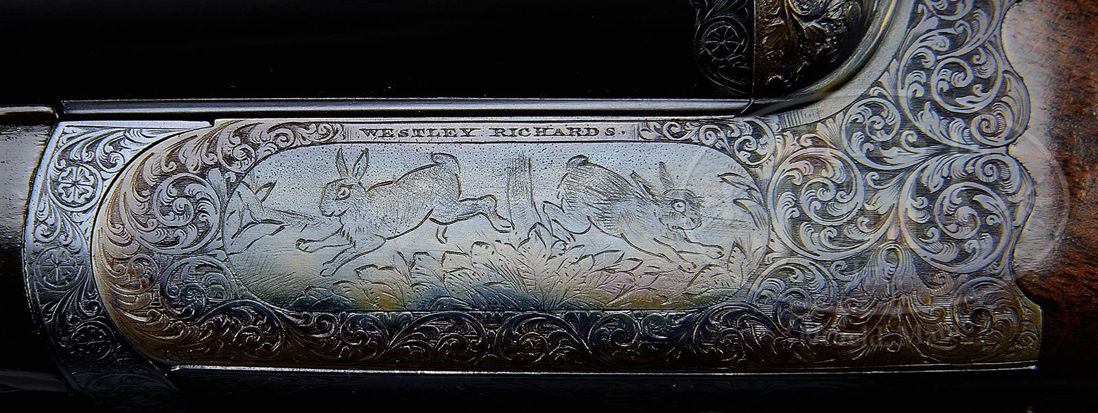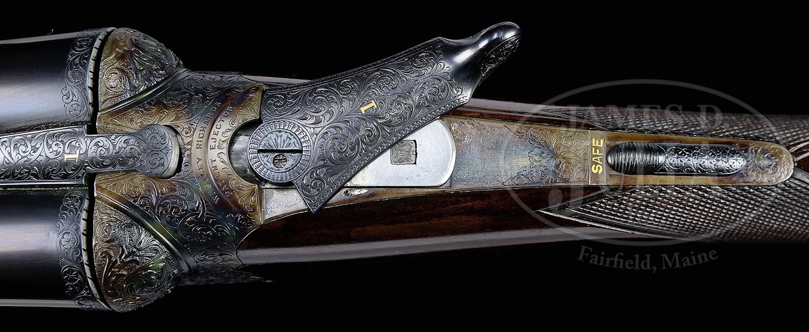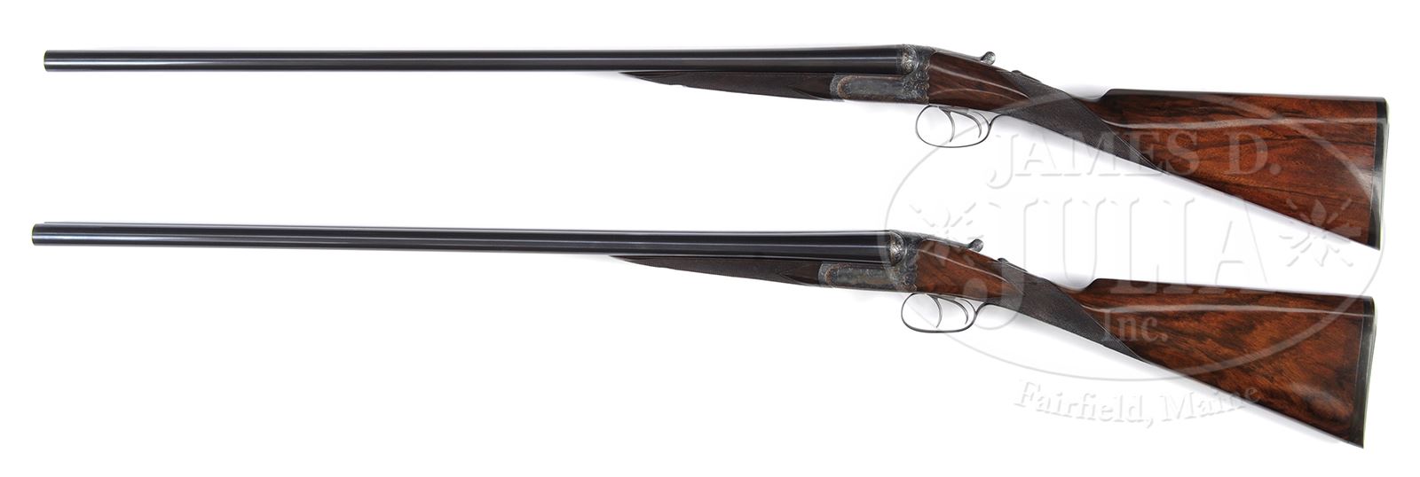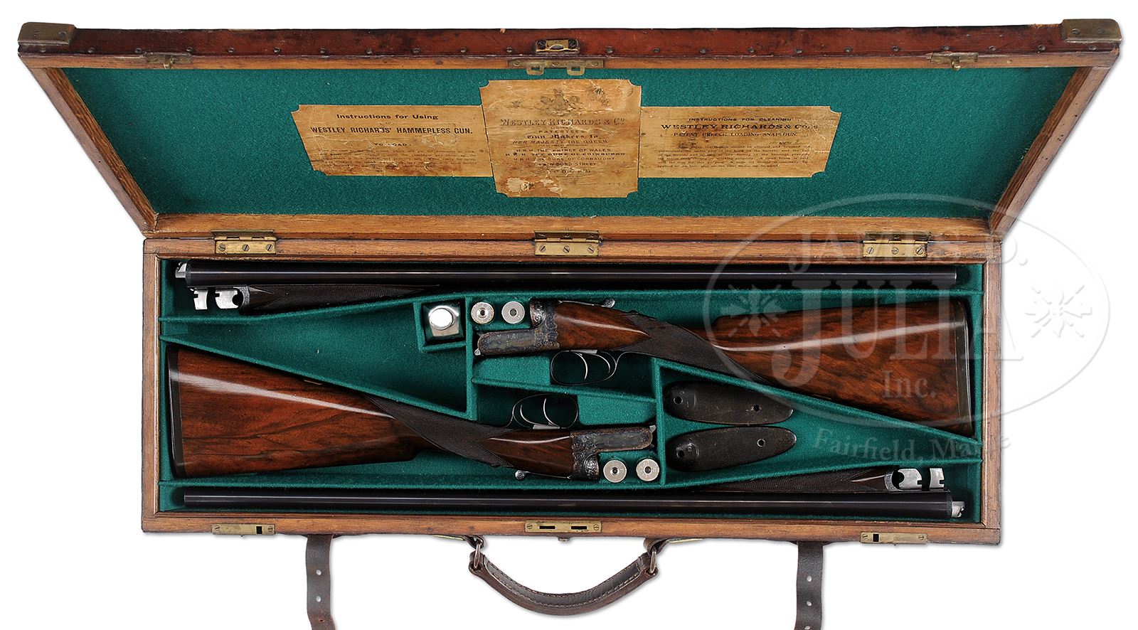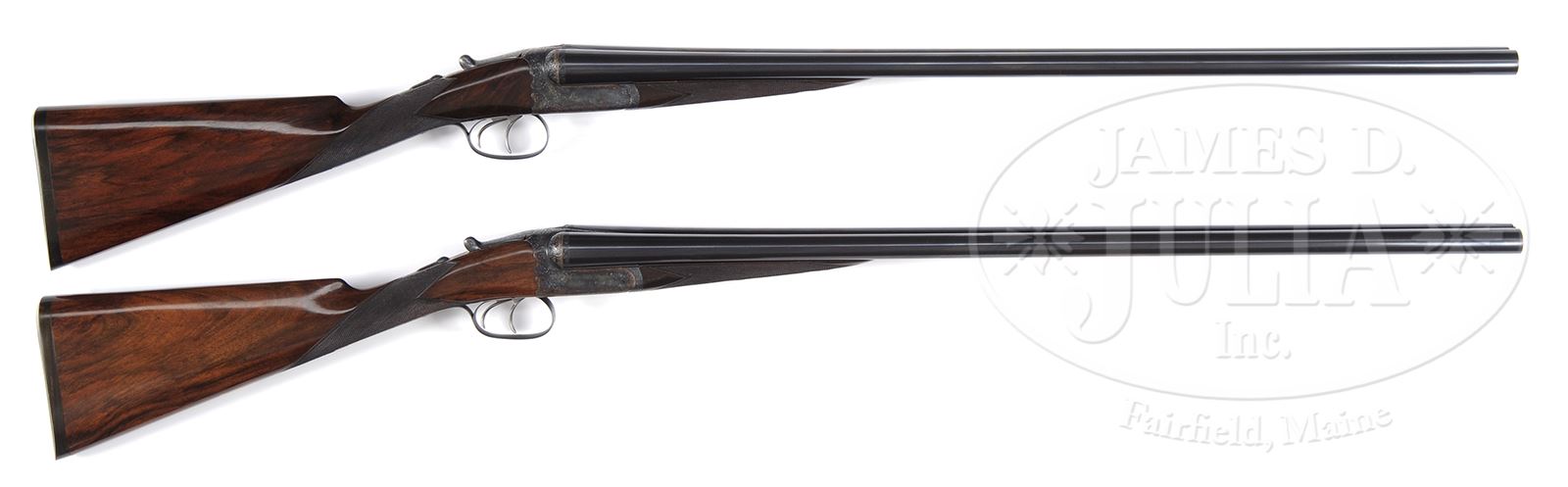 PAIR OF EARLY WESTLEY RICHARDS DELUXE HAND DETACHABLE LOCK GAME GUNS WITH CASE.SN 15817/ 15818. Cal. 12 GA 2-3/4″ Chambers. 1899 Vintage. 30″ Chopper lump bbls are fitted with deeply swamped, narrow, game ribs, and are engraved “WESTLEY RICHARDS 178 NEW BOND ST LONDON.” and “WHITWORTH FLUID COMPRESSED STEEL” on tops. Rib extensions are scroll engraved and gold inlaid with “1” or “2”. These numbers also appear in gold on top levers and Deeley catches on forends. Bbl flats are stamped with Birmingham black powder proofs and nitro re-proofs for 2-1/2″ chambers. Bottoms of bbls are stamped with SNs and “WHITWORTH STEEL”. Case hardened, scallop-backed actions feature automatic safeties (SAFE inlaid in gold), bushed strikers, dbl triggers, and Westley Richards patented sliding third fasteners. Actions are also fitted with very early Deeley patent hand detachable locks. Locks are engine turned and engraved “Patent 17731” and “1897”. They are marked for “left” and “right”. Floorplates are of early removable type. Water tables are stamped with patent information and use numbers “18” and “19”. Actions are embellished in “Deluxe” style with deep chiseled acanthus fences and near full coverage of exceptionally well cut open shaded scroll surrounding rather naive game scenes; gun no. “1” has a single running rabbit on left side, with a pair of rabbits on left side of gun no “2”. Right side of gun “1” depicts a trio of pheasant (?) in mountainous background, gun no. “2” has a pair of standing partridges. Circular scenes on trigger plates each depict a single snipe. A pheasant is on trigger guard bow of gun “1”, and a trio of grouse on gun “2”. “WESTLEY RICHARDS” is on both sides of action on both guns. Well matched, nicely marbled European walnut straight grip buttstocks measure 15″ over 1/2″ thick checkered horn buttplates. Standard checkering is at grips. Matching splinter Deeley ejector forends have inset horn tips and Deeley releases. Gun no. “1”: Bore diameter: left -.740, right -.734. Bore restrictions: left -.031 (full), right -.003 (IC). Wall thickness: left -.017, right -.022. Drop at heel: 2″, drop at comb: 1-9/16″. Weight: 6 lbs 8 oz. LOP: 15″. Gun no. “2”: Bore diameter: left -.734, right -.735. Bore restrictions: left -.031 (full), right -.002 (IC). Wall thickness: left -.023, right -.020. Drop at heel: 2-1/8″, drop at comb: 1-9/16″. Weight: 6 lbs 10 oz. LOP: 15″. Makers oak and leather case, possibly original, is finished in typical Westley Richards style, has been re-lined in green cloth with Westley Richards paper labels reinstalled. Case has space for both guns, and contains two pairs of snap caps and a square oil bottle. CONDITION: Excellent, as completely refinished, retaining essentially all well done finishes on wood and metal, with a few light handling marks. Engraving slightly softened on blued parts. Bores are excellent with some light striations, and a few light pits. Left bbl of gun “1” is slightly rivilled 10″ back from muzzle. Actions are tight. Gun no. “1” is somewhat off face. Gun “2” is on face. Ejectors are slightly out of time on gun “1”, in time on gun “2”. Case leather is considerably darkened with numerous scuffs and marks. Renewed interior cloth is excellent. Orig labels are considerably foxed, chipped, and soiled. 49416-4 MGM282 (15,000-20,000) – Lot 2281
