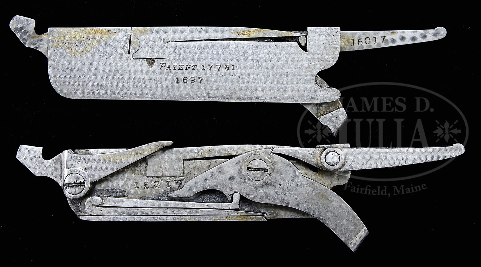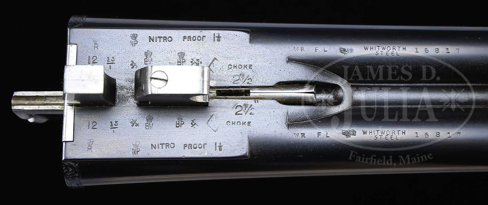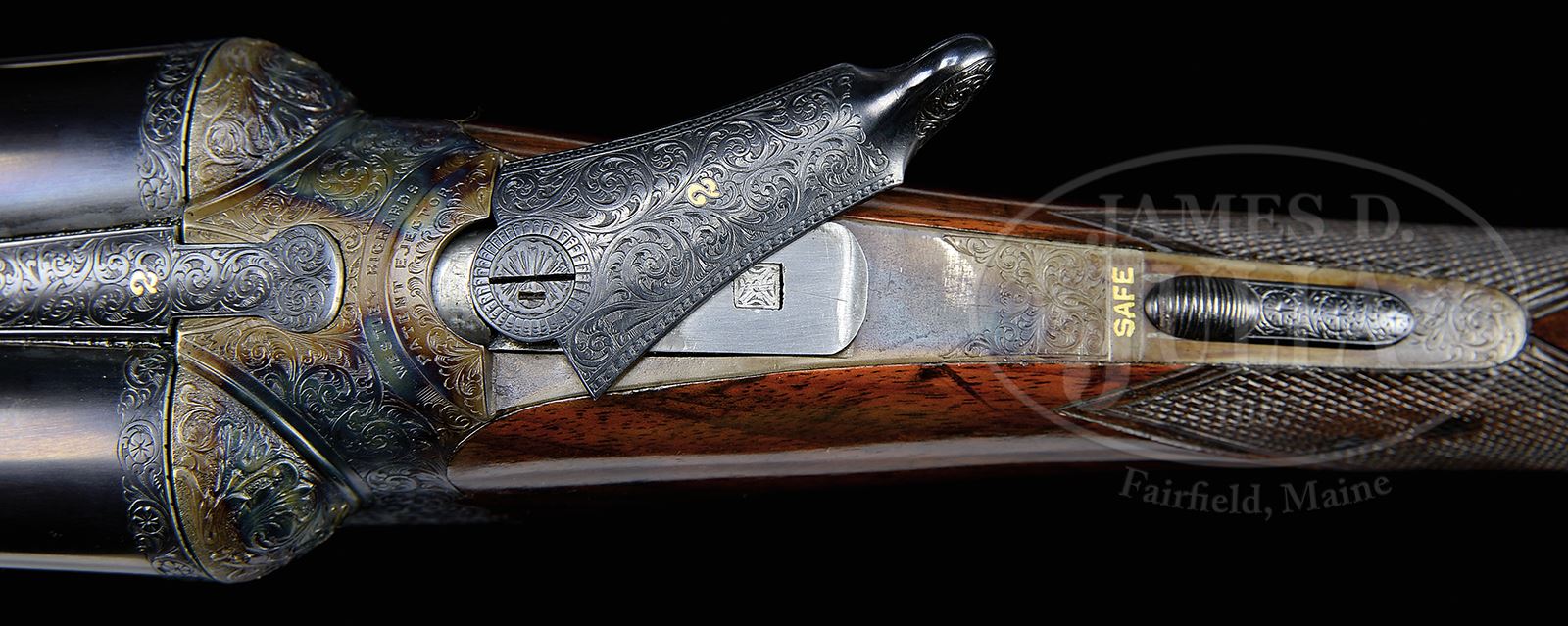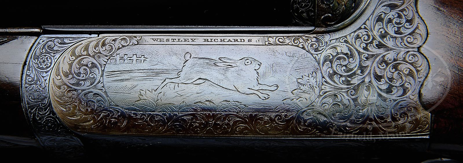 PAIR OF EARLY WESTLEY RICHARDS DELUXE HAND DETACHABLE LOCK GAME GUNS WITH CASE.SN 15817/ 15818. Cal. 12 GA 2-3/4″ Chambers. 1899 Vintage. 30″ Chopper lump bbls are fitted with deeply swamped, narrow, game ribs, and are engraved “WESTLEY RICHARDS 178 NEW BOND ST LONDON.” and “WHITWORTH FLUID COMPRESSED STEEL” on tops. Rib extensions are scroll engraved and gold inlaid with “1” or “2”. These numbers also appear in gold on top levers and Deeley catches on forends. Bbl flats are stamped with Birmingham black powder proofs and nitro re-proofs for 2-1/2″ chambers. Bottoms of bbls are stamped with SNs and “WHITWORTH STEEL”. Case hardened, scallop-backed actions feature automatic safeties (SAFE inlaid in gold), bushed strikers, dbl triggers, and Westley Richards patented sliding third fasteners. Actions are also fitted with very early Deeley patent hand detachable locks. Locks are engine turned and engraved “Patent 17731” and “1897”. They are marked for “left” and “right”. Floorplates are of early removable type. Water tables are stamped with patent information and use numbers “18” and “19”. Actions are embellished in “Deluxe” style with deep chiseled acanthus fences and near full coverage of exceptionally well cut open shaded scroll surrounding rather naive game scenes; gun no. “1” has a single running rabbit on left side, with a pair of rabbits on left side of gun no “2”. Right side of gun “1” depicts a trio of pheasant (?) in mountainous background, gun no. “2” has a pair of standing partridges. Circular scenes on trigger plates each depict a single snipe. A pheasant is on trigger guard bow of gun “1”, and a trio of grouse on gun “2”. “WESTLEY RICHARDS” is on both sides of action on both guns. Well matched, nicely marbled European walnut straight grip buttstocks measure 15″ over 1/2″ thick checkered horn buttplates. Standard checkering is at grips. Matching splinter Deeley ejector forends have inset horn tips and Deeley releases. Gun no. “1”: Bore diameter: left -.740, right -.734. Bore restrictions: left -.031 (full), right -.003 (IC). Wall thickness: left -.017, right -.022. Drop at heel: 2″, drop at comb: 1-9/16″. Weight: 6 lbs 8 oz. LOP: 15″. Gun no. “2”: Bore diameter: left -.734, right -.735. Bore restrictions: left -.031 (full), right -.002 (IC). Wall thickness: left -.023, right -.020. Drop at heel: 2-1/8″, drop at comb: 1-9/16″. Weight: 6 lbs 10 oz. LOP: 15″. Makers oak and leather case, possibly original, is finished in typical Westley Richards style, has been re-lined in green cloth with Westley Richards paper labels reinstalled. Case has space for both guns, and contains two pairs of snap caps and a square oil bottle. CONDITION: Excellent, as completely refinished, retaining essentially all well done finishes on wood and metal, with a few light handling marks. Engraving slightly softened on blued parts. Bores are excellent with some light striations, and a few light pits. Left bbl of gun “1” is slightly rivilled 10″ back from muzzle. Actions are tight. Gun no. “1” is somewhat off face. Gun “2” is on face. Ejectors are slightly out of time on gun “1”, in time on gun “2”. Case leather is considerably darkened with numerous scuffs and marks. Renewed interior cloth is excellent. Orig labels are considerably foxed, chipped, and soiled. 49416-4 MGM282 (15,000-20,000) – Lot 2281