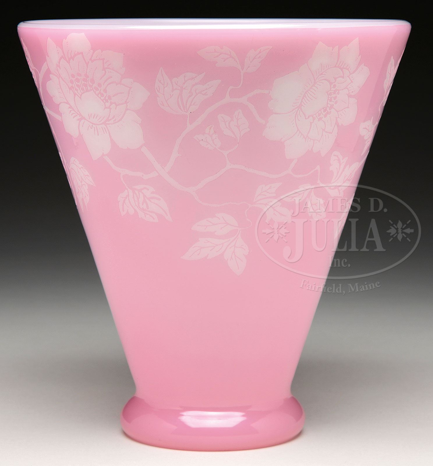 STEUBEN ACID CUT BACK VASE.Steuben vase has rosaline overlay on alabaster with acid cut back flowers and vines surrounding top half of the vase. Unsigned. SIZE: 8-1/2″ t. CONDITION: Very good to excellent. 5-68721 (600-900) – Lot 2282