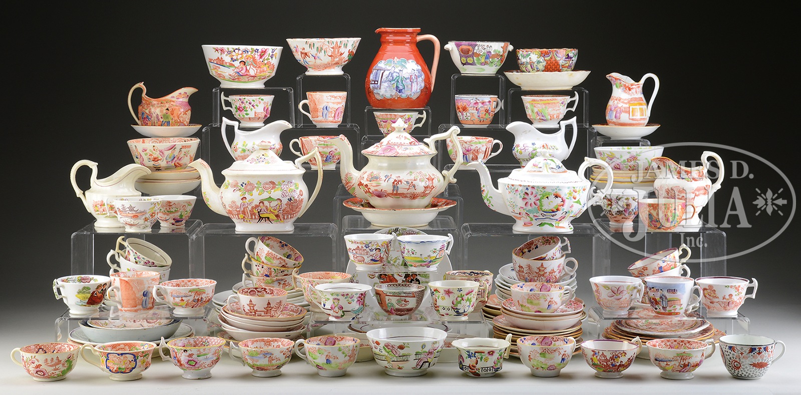LARGE LOT OF 136-PIECE ASSEMBLED SOFT PASTE PORCELAIN IN CHINOISSERE STYLE.Late 18th/19th Century. Lots consists of 136 pieces of soft paste porcelain decorated in various patterns all in a chinoissere style. Consisting of 3 teapots, handled pitcher, numerous waste bowls, cups & saucers. SIZE: Varies: Pitcher – 6-1/4″ h; Largest pot is 10-3/4″ dia including handle & spout; Dishes: Between 9-1/2″ and 4-3/4″ dia. CONDITION: Chips, cracks, restorations & losses. 50080-30 (800-1,200) – Lot 2283
