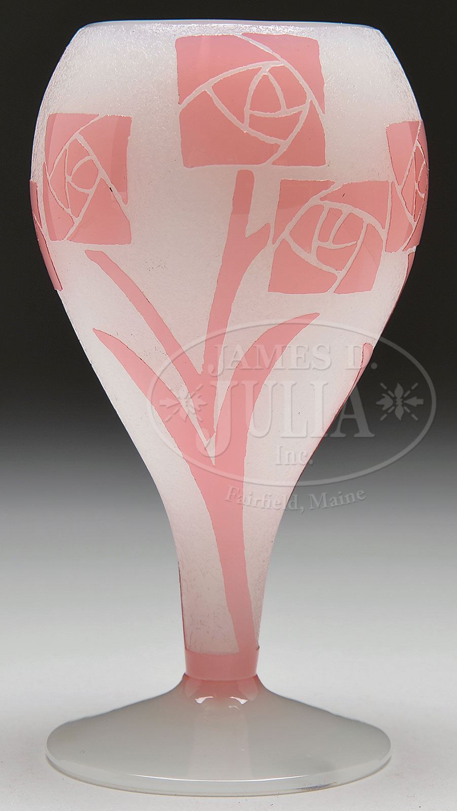 STEUBEN ART DECO VASE.Steuben vase has rosaline acid cut back stylized flowers against an acid textured alabaster background. The vase rests on an alabaster inverted saucer foot. Unsigned. SIZE: 6″ t. PROVENANCE: James Boma Collection. CONDITION: Very good to excellent. 5-69664 (600-900) – Lot 2284