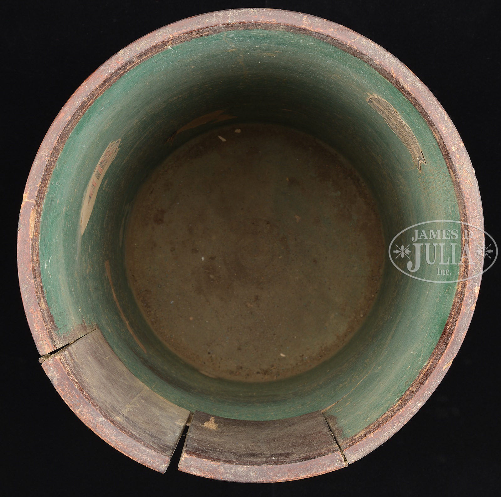 LARGE COMPOSITION MOXIE STORE DISPLAY BOTTLE.Scarce variant of these store displays seldom seen. This version features a metal bottle cap and an upper detachable section that lifts off to access the interior. The reverse side has two hinged curved door panels. The top portion of the original paper label reads “Beverage Moxie Nerve Food/Contains Not a Drop of Medicine, Poison, Stimulant or Alcohol”. Bottom of the display is marked “United Indurated Fibre Co., Lockport, N.Y./Patented May 25, 1886”. SIZE: 35″ t. CONDITION: The fiber composition bottle is in very good condition with original alligator-finish surfaces. The paper label shows heavy staining and paper loss. 48648-1 (1,500-3,000) – Lot 2284 Auction: Advertising, Toy & Doll - Spring 2015 Please Note: All prices include the hammer price plus the buyer’s premium, which is paid by the buyer as part of the purchase price. The prices noted here after the auction are considered unofficial and do not become official until after the 46th day. |