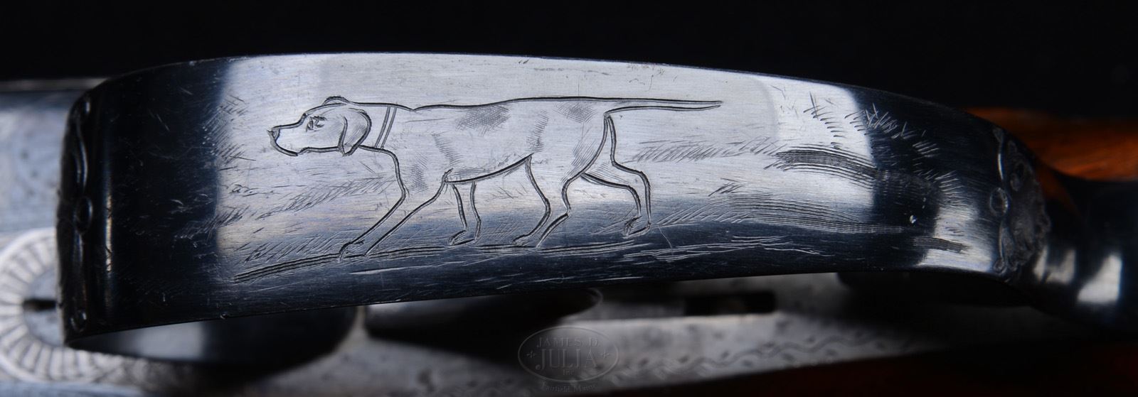 NICELY REFURBISHED WESTLEY RICHARDS BOXLOCK EJECTOR GAME GUN.SN 14712. Cal. 12 ga. 2-1/2″ Chambers. 30″ Dovetailed Whitworth steel bbls are so marked on concave game rib. Bbl flats are stamped with Birmingham nitro proofs for 1-1/8 oz of shot. Bottoms of bbls have Whitworth sheaf of wheat trademarks. Anson Deeley boxlock (patent use no. 10556) action features automatic safety (SAFE gold inlaid), Westley Richards patent third fastener with dolls head extension, and double triggers. Action is engraved with 70% coverage nicely cut small scroll. “WESTLEY RICHARDS” is in ribands on each side. Top lever, floorplate, and trigger guard are blued, and also scroll engraved. Trigger guard has hunting dog on bow, and SN at grip. Very finely made new stocks, possibly by Westley Richards as style and quality is of that caliber, consist of nicely marbled and figured European walnut straight grip buttstock measures 15″ over Silver type pad. Side panels are checkered and drop points are classic Westley type. Point pattern checkering is very well executed and borderless. Matching splinter forend with inset horn tip, fitted with Deeley ejector, has Deeley release. Bore diameter: left -.731, right -.734. Bore restrictions: left -.040 (extra full), right -.017 (mod). Wall thickness: left -.031, right -.027. Drop at heel: 2-1/4″, drop at comb: 1-3/8″. Weight: 6 lbs 12 oz. LOP: 15”. CONDITION: Very fine, as refurbished. Newer bbls are nicely struck and retain nearly all of what appears to be a fine satin re-black. Action is coin finished, engraving still clear. Top lever and floorplate are re-blued, and retain over 90% of that blue, engraving slightly washed. New trigger guard is silvered at grip. Newly made stocks retain nearly all of their fine hand rubbed oil finish, with numerous light marks and scratches. Checkering still light in color, and lightly worn. Bores are excellent. Action is tight. Bbls are slightly off face. Ejectors are strong and in time. Bottom portion of third bite on rib extension is broken off. 49183-21 MGM24 (3,000-5,000) – Lot 2284