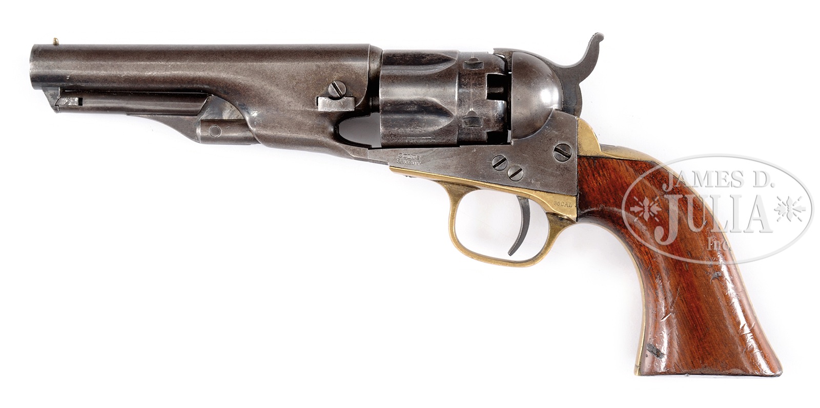 COLT 1862 POLICE PERCUSSION REVOLVER.SN 30316. Cal. 36. Rnd bbl shortened to 4-1/2″, having reinstalled bead and standard NY address marking. 5 shot fluted rebated cyl. Brass grip straps, 1-pc walnut grip. Bbl, frame, grip straps and wedge have matching numbers. Cyl and loading lever have no visible numbers. PROVENANCE: The Dr. Robert G. Cox Estate Collection. CONDITION: Fair. Metal shows traces of orig finish, fading to even gray patina. Grip straps retain traces of silver finish in protected areas. Orig grip finish shows moderate wear with dents and chips near butt. Good mechanics. Bore shows good rifling. 50582-53 DS (1,000-1,500) – Lot 2284
