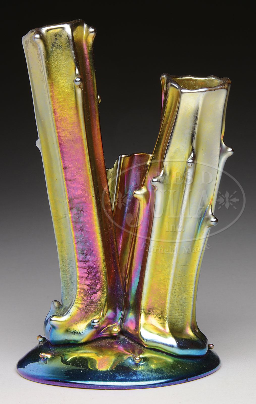STEUBEN TREE TRUNK VASE.Steuben gold aurene tree trunk vase has three trunks of different sizes extending from the round foot. Vase is finished in bright gold iridescence with strong red, blue and pink highlights. Signed on the underside “Steuben Aurene 2744”. SIZE: 6-1/4″ t. PROVENANCE: Private New England Collection. CONDITION: Very good to excellent. 5-69268 (500-700) – Lot 2286