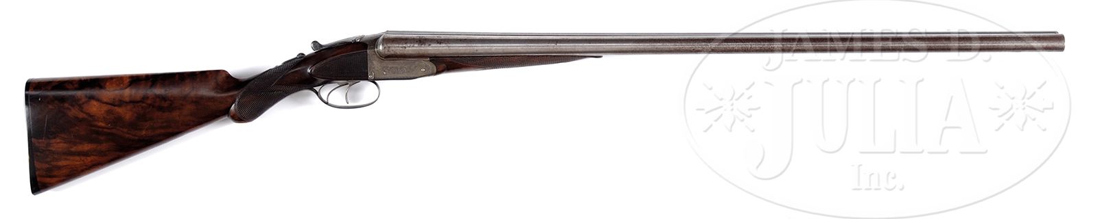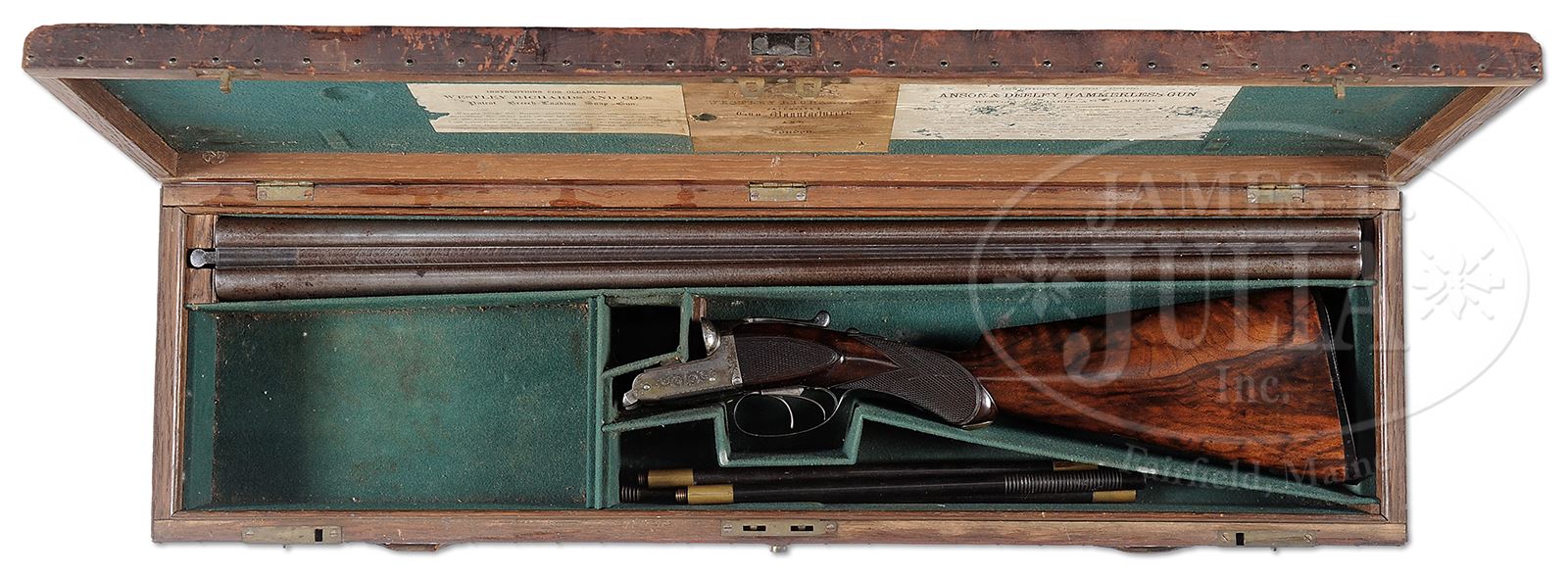 HISTORICALLY IMPORTANT, PATENT USE NUMBER 19, WESTLEY RICHARDS ANSON & DEELEY BOXLOCK GAME GUN WITH CASE.SN 5112. (1876) Cal. 12 ga. 2-1/2″ Chambers. This cool gun, the 19th A & D boxlock ever made, has 30″ skelp Damascus bbls fitted with concave game rib engraved “Westley Richards. 170. New Bond St. London.” Bbl flats are unmarked. Bottoms of bbls are stamped with SNs, “C.M”, and early Birmingham black powder proofs for 12 bore and 13 muzzles, along with “NOT FOR BALL”. Front portion of lump dovetail is stamped “19”. Very early styled A & D boxlock action features Westley Richards patent sliding bolt engaging dolls head bbl extension, automatic safety (SAFE gold inlaid), and extremely early square, pointed cocking lugs. Floorplate is also of early humped design. Water table is stamped “Anson & Deeley’s patent” and “19”. Action is engraved with about 50% coverage very well cut shaded scroll. “Westley Richards” is on each side. Blued top lever is engraved “Westley Richards Patent”. Blued floorplate and trigger guard are engraved with large open scroll. SN is at grip, partially obscured by trigger guard tang screw, as stock has been converted from straight to semi-pistol grip. Finely marbled and lightly figured European walnut round knob pistol grip buttstock measures 14-1/2″ over well done checkered horn buttplate. Side panels and grip are flat top checkered and have mullered borders. A vacant heavy gold oval is set on end of grip. A vacant silver rectangle is on toe line. Matching splinter forend with inset horn tip has Deeley release marked “PATENT” with monogram “DE” on latch. Forend iron is stamped “19”. Bore diameter: left -.737, right -.737. Bore restrictions: left -.018 (mod), right -.005 (IC). Wall thickness: left -.033, right -.032. Drop at heel: 2-1/16″, drop at comb: 1-13/16″. Weight: 6 lbs 15 oz. LOP: 14-1/2”. Possibly orig makers oak and leather case with sliding latches and push button release, is embossed “C.G. Francklyn” on top. Remnants of a Cunard line steamship label are at right. Interior is lined in green cloth, and has Westley Richards paper label in lid flanked by two other paper labels with instructions for using Anson & Deeley hammerless gun, and another with instructions for cleaning. Case contains 3-pc heavy brass and ebony cleaning rod with jag. CONDITION: Fine. Bbls retain a considerable amount, perhaps 30 – 40%, orig Damascus finish, considerably silvered from hand wear and some light overall freckling. Action retains 40 – 50% orig case hardening color, which has been lacquered for protection. Top lever, floorplate, and trigger guard have been nicely re-blued, and retain nearly all of that blue, engraving remains clear. Stocks retain most of an old oil finish with numerous marks and nicks, checkering re-cut. Buttplate is relatively new, fitted over remnants of orig spur. Bores are very fine, shiny, with some light frosting and a few scattered pits in right bbl. Action is tight. Bbls are on face. Case leather is dark, scarred, rubbed, and chipped. Straps and handle are missing. Interior cloth is good, lightly soiled, and a bit dusty. Partitions are good. Makers label is considerably foxed, with a rub-through. Accessory labels show light foxing and considerable insect damage. A very shootable interesting Westley Richards. 49266-1 MGM55 (3,000-5,000) – Lot 2286