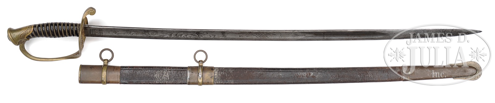 SWORD AND WARTIME “BULL RUN” LETTER OF LIEUTENANT GEORGE I. BROWN 2ND MAINE INFANTRY.Included in this lot is an “as found” model 1850 US foot officer’s sword. Sword is in overall fine condition with a bright, frosty etched blade with patriotic motifs. Accompanying orig scabbard is sound and solid with matching patina to mounts. Long 4-pg (quarto) letter was written from Camp Rice, Arlington Heights, VA August 6, 1861. Lt. Brown is writing to his wife and family telling of his travels to the Manassas Battle Field in detail for 5 days July 16 till the date of the battle he had encountered many rebels and he and his men had captured many chickens and pigs and had had quite a feast before 1 am July 21st, 1861 “…we started for the battle or Bulls Run. Bloody Run is the name of it now…the battle commenced at 8 am…I fell on my face…cannon shot and shell went right over my head, this falling on my face saved my head this time, one of the shells struck a few yards from me and bursted. If I had been standing up it would hurt me…as soon as this shell went off I got up and started but they gave me another shot before I could get to the woods but did not hurt me…I had to run back the same way and take our wounded man and leave as fast as we could towards the house where our wounded stay. The cavalry was close to us when I got to the house I was all gone and could not go quite so well and wanted to. So Rubin Huchings took me in charge he helped me down to the bridge and it was so crowded with people that we could not get across it and we forded the river, some got drowned and the most got through safe…”. There are many more interesting details to this letter that should be read by perspective bidders. You can read hundreds and hundreds of Civil War letters before you find such a detailed letter on this early event of the war. Transcription of the letter as follows: A sketch from Bull Run by our own artist, _____ Brown Camp Rice Arlington Heights August 6th, 1861 Dear wife and children, I suppose that you would like to have a sketch or a line of our or my travels from Falls Church. We left there July the 16, 1861 for Fairfax Court house. Did not see much on our rout untill we got to ____ depot. There the rebels had burnt all the ____. We stopped just the other side of the depot in a field with some 14,000 troops. Just as we had got laid down to sleep and some had gone to sleep one of the officers horses got frightened and ran over every one that he chose. He ran over a number of our Reg and hurt some quite badly but did not hurt any of our company. We arose early the next morning and eat our hard bread & beef.. and at 5am we left for Centerville or Fairfax Court house. Not much of anything transpired untill we got to the court house or in sight as we went up on the hill just above side of the town. Our artillery was behind and just as we got upon this hill. We fell out by the side of the road and let theirs park. One Batery ____ south. One fellow on the carriage was going fast or fell off on his butt but got up again and caught up with the Batery and got on. As this battery was firing at and into the town to see what was there out come the Rebels and retreated double quick. I could see them plain from the hill. As soon as this was noticed we advanced on them. We had 2 regiments out as ____ one on each side of the road. We had to march slowly so as to be sure not to get into any traps. We tried to catch them by going around through Germantown. But just before we got there our ____ found a hedge across the road where we were going. The rebels had fell all the trees that was any where nigh the road and on both sides of the road. So we had to wait untill ____ and some others chopped it away. As soon as we got through this we discovered a Batery this side of Germantown and we brought up our rifled canon and fired a few shots into the battery and the rebels left quick enough. The shot went through the Batery and through the top of a house in the town and a black man was very much frightened when the shot went through. The rebels left a lot of harm and other things. We marched over there Batery, the very place where our shot went through, stoped a few moments to get some watter in the town and put up the Stares & Stripes. Some of the boys wrung all of the chickens necks and killed all the pigs they had time to. We got a pig and roasted him that night when we stopped. He was very good indeed. We laid in an open field this night. Had an alarm about 2 in the morning got ready to fight but the rebels went back and we laid down but did not sleep much. Took cavelry all sub__ horses and all took up our line of march early in the morning found trees fell acrost the road but soon cut them away. We marched today and as guard for the teems in rear of all the rest. We marched into Centerville without fireing maney guns, stopped this side of the town 2 dayes to rest. Started July 21st 1861, 1, oclock in the morning we started for the Battle on Bull Run, Bloody run is the name of it now. We traveled on slowley and let the other regiments catch up with us. The battle commenced at 8am, we took some ____ in the morning got a bridge already to but across the river in place of one that the Rebels burnt when the ____ ordered our Reg to start for the Rebels we went double quick time about 9 miles with the sun beating down upon us very hot and there was not a breath of wind. We throwed away out blankets and haversacks and some throwed away there coats. The ground was showered with blankets etc. When we got into line of battle we were all beat out. We marched right on to a masked Batery, got within a few, rode and received the Rebel fire, the rest it is not best to write. The battle lasted 10 houres. We were ordered to retreat ____ before we did last on our side 1,000. On there 4,000 there forse was 9,000 and ours was but 10,000 that was in the battle. We marched that night all night, arrived in Alexanrd