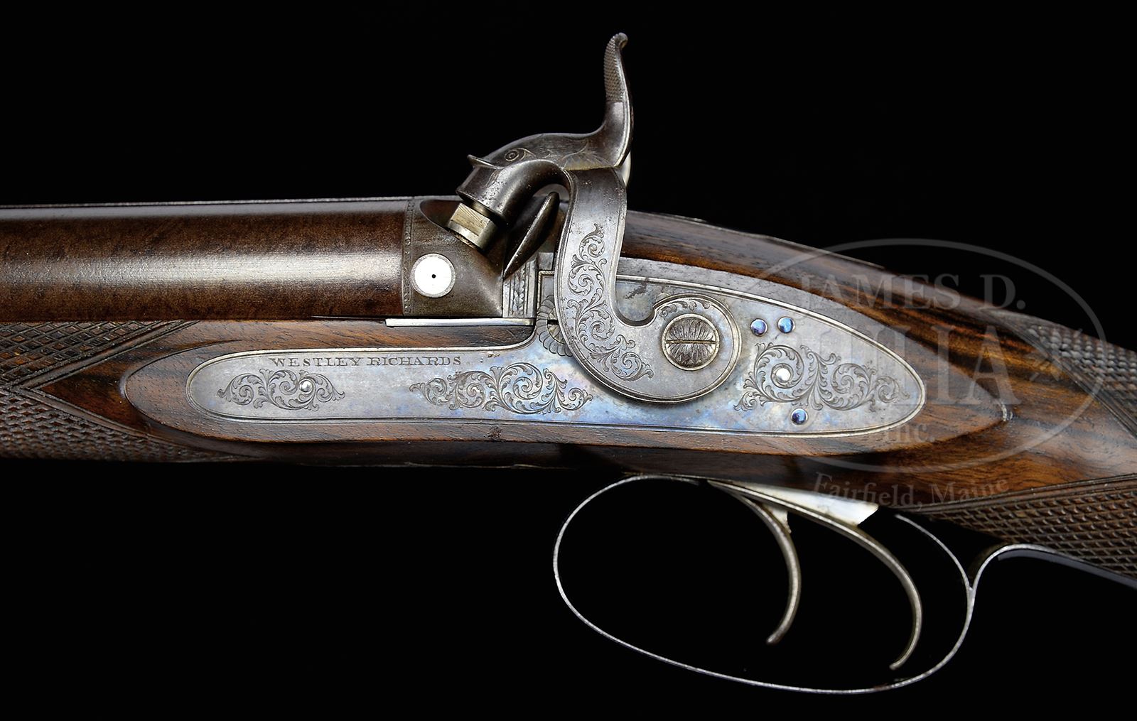 VERY FINE PAIR OF WESTLEY RICHARDS PERCUSSION 14 BORE GAME GUNS WITH ORIGINAL TWO-TIERED MAHOGANY CASE AND ACCESSORIES.SN 9209/ 9210. (ca 1859) Cal. 14 ga. 30″ Skelp twist bbls are engraved “WESTLEY RICHARDS. 170. NEW BOND ST. LONDON.” on broad concave game ribs. Bottoms of bbls are stamped with Birmingham black powder proofs for 14 bore, and with SNs. Patent breeches have vented platinum blow-outs and platinum inlaid lines at rears. SNs are stamped on hooks. Orig ebony ramrods with brass tails with steel worms under caps, have brass tulip shaped heads with SNs stamped on ends. Ramrods are held by two plain pipes. Case hardened and scroll engraved breech irons have integral fences and are mounted on silver flash guards. Island type front action locks have tall flat faced serpentine hammers with engraved dolphin heads. Locks and hammer faces are engraved with exceptionally well cut open foliate scroll. “WESTLEY RICHARDS” is on each lockplate. Trigger plates have stylized pineapple finials matching those on thimbles. Blued trigger guards are scroll engraved on bows and have SNs at grips. Dense, streaked, and figured European walnut stocks measure 14-1/4″ over steel buttplates with long scroll engraved top tangs. Boldly cut flat top point pattern checkering with mullered borders is at grips and forends. Stocks mount to bbls with captive side nails through oval silver escutcheons. Gun 9209: Bore diameter: left -.693, right -.692. Wall thickness: left -.049, right -.040. Drop at heel: 2-3/16″, drop at comb: 1-1/2″. Weight: 7 lbs 3 oz. LOP: 14-1/4”. Gun 9210: Bore diameter: left -.694, right -.694. Wall thickness: left -.040, right -.042. Drop at heel: 2-1/8″, drop at comb: 1-1/2″. Weight: 7 lbs 4 oz. LOP: 14-1/4”. Deep mahogany case has inlet arched brass corners, typical circular D-ring handle, pivoting hook closure, brass reinforcing straps on sides, and folding bail carrying handles on sides. Interior is lined in dark green cloth, and has Westley Richards rectangular paper label in lid stating “Westley Richards Gun Manufacturer to His Royal Highness PRINCE ALBERT”. Gun numbers are penciled in bottom rail of lid. Interior has lift-out tray for stocks. Bbls and accessories fit in bottom compartment. Top section has receptacles for two Sykes type charge/ shot containers, and 14 bore wad punch. Bottom has compartments for a pair of James Dixon black leather covered German silver powder flasks and matching shot pouches, one by Sykes. Also included are an early mainspring vice, and a T-handled nipple wrench with copper covers over nipple receptacles in handle. Also included is a 3-pc rosewood, ebony, and brass cleaning rod which does not fit into case. PROVENANCE: Factory letter stating guns were completed 4 May 1859. CONDITION: Gun 9209 is very fine, as partially refinished. Bbls retain most of an old re-brown with fair definition to pattern over considerable light pitting, with some spots of heavier pitting. Trigger plate, lockplates, and breech iron retain a considerable amount, perhaps 40% of their orig case hardening color with browning, staining and evidence of cleaning. Trigger guard retains most of its orig bright blue. Buttplate is mostly gray to brown patina with bright blue on top tang. Stock retains most of its orig rubbed oil finish with numerous minor marks and dings, checkering lightly worn. Gun no. 9210 is in much better original condition. Bbls have been re-browned over some light pitting, unfortunately breech plugs were not removed and their orig case color is muddied. Locks and breech iron retain approx 90% orig color. Trigger guard and buttplate retain over 90% of their orig brilliant blue. Stock has some minor marks. Left side of side nail head is chipped off. Both ramrods are original. Bores of both guns are lightly pitted and need a good cleaning. Nipples are modern replacements. Locks are crisp. Case is excellent retaining most of what appears to be its orig finish on exterior. Brass is unpolished, some still remains bright. Interior cloth is very fine, with some spots of fading and light soiling. Label is very fine, slightly foxed with some rust stains and one rub-through. Lift out tray and all partitions are excellent. One flask is excellent, except for some marks in leather and a missing spring. The other flask shows more wear, some darkening of German silver, however spring is intact. Dixon shot pouch is excellent with some creases in leather and staining on steel lever. Sykes pouch shows considerable wear and toning. Mainspring vice is good with a repair at thumbpiece. Nipple wrench has traces of case color. Sykes chargers have been re-polished. Wad cutter has traces of blue, but is mostly brown patina. Cleaning rod is good. 49094-1 MGM32 (12,500-22,500) – Lot 2287 Click here to view provenance
