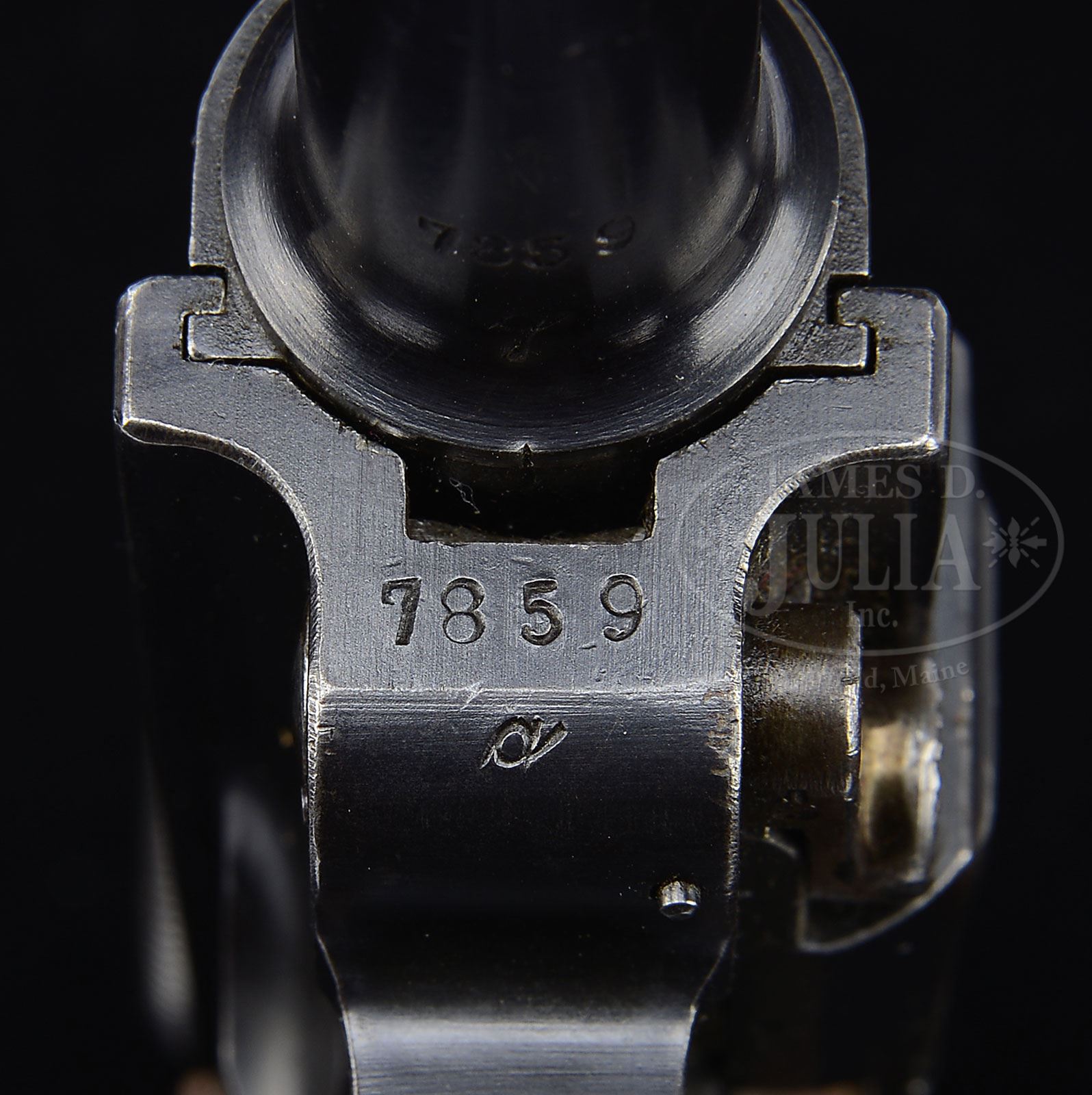 *◊ RARE SPANDAU REWORKED DWM 1920 POLICE CONTRACT LUGER PISTOL.SN 7859q. 30 Cal. 4″ bbl. DWM scroll on center toggle link. “Su/25” proof on right receiver. Crown/N on left receiver and toggle assembly. Receiver and toggle assembly numbers are hand engraved with electric pencil. Numbered parts on gun are matching. Unnumbered checkered walnut grips. Proper wood bottom magazine with numbers that do not match. This gun is featured on p. 476 of The Borchardt & Luger Automatic Pistols by Joachim Gortz & Dr. Geoffrey Sturgess. PROVENANCE: Collection of Dr. Geoffrey Sturgess. CONDITION: Fine. Retaining 95% blue and 75% straw. Grips are lightly worn with indents to checkering. Wood grain is still visible. Bore is bright and sharp. Magazine retains 80% blue on body and has minor wear with small chips on wood bottom. Mechanics are sound. 4-52951 (1,750-2,750) – Lot 2288