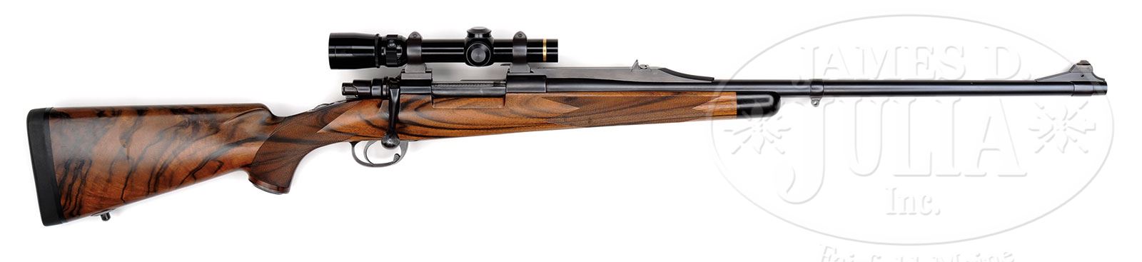 James D. Julia Auctioneers complies with all federal laws and regulations (Please review our Ivory Position Statement): James D. Julia cannot guarantee the age of the ivory on this gun. So all ivory will be removed. You are buying the gun only. You will not and cannot acquire the ivory. *L. BROWNELL STYLE CUSTOM MAUSER DANGEROUS GAME RIFLE WITH SCOPE.SN 4564. Cal. .375 H & H. 24″ Medium weight round sporter bbl is fitted with tall quarter rib which extends over action receiver ring and forms scope base. A rectangular panel on top of rib is stippled, and a one standing, two folding leaf express sight has been fitted. Bbl also features banded-on front sling eye and front sight base mounted with height extension and ivory bead. Left rear of bbl is marked with caliber. Model 1909 Argentine Mauser action has had rear tang extended to form base for tang safety. Front portion of magazine box is extended to accept long cartridge. A Canjar trigger has been fitted and bolt shroud replaced with FN type. Bolt handle has pear shaped knob with four teardrop panels of checkering. Bolt body has been engine turned. A button has been welded to floorplate release inside trigger guard bow, which has been nicely streamlined. Beautifully marbled and nicely figured “English” walnut stock measures 13-5/8″ over black Decelerator solid pad. Stock features nicely shaped, shadow line, swept right hand cheekpiece, and exceptionally well cut borderless point pattern checkering at grip and around forearm. Other appointments include ebony forearm tip, sling eye, and very fine scroll engraved trap grip cap, cover gold inlaid with initials “RBL”. Trap contains a small Allen wrench to adjust trigger. A Leupold Vari-X III 1.5 – 5 X scope with duplex reticle is in Talley type mounts stamped “LB”. Drop at heel: approx 2″, drop at comb: approx 1-3/4″. Weight with scope: 9 lbs 5 oz. LOP: 13-5/8″. PROVENANCE: The Dr. Edmund Lewis Collection. CONDITION: Excellent, retaining approx 95% orig custom blue. Stock retains most of its orig finish with a number of small handling marks and dents. Checkering is lightly worn. Bore is excellent. Action is smooth. Scope is excellent, with a few small marks. Crisp optics. 4-51221 MGM2 (4,500-6,500) – Lot 2289a