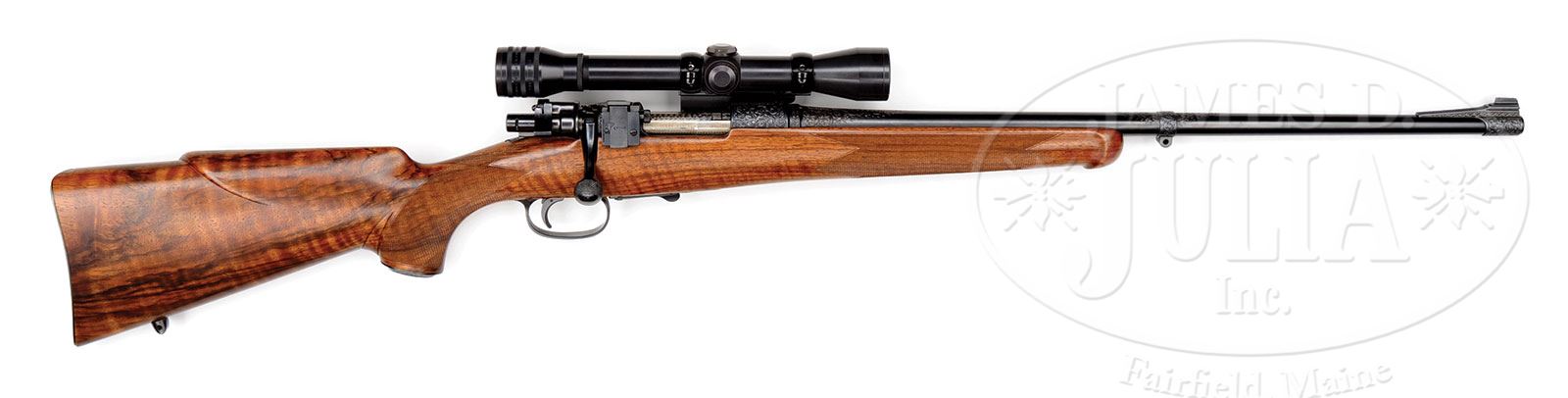 *SHELHAMER STOCKED NIEDNER CUSTOM RIFLE ON MAUSER K ACTION WITH SCOPE.SN 103492. (found on bottom of action which must be removed from stock to view) Cal. .284. 22″ Tapered round bbl has sleeved-on sling eye and front sight base. Top left is marked “Niedner Rifle Corp, Dowagiac, Mich.” and “Cal. 284″. Short commercial Mauser square bridge K action (Mauser logo on recoil lug) has been fitted with Lyman 57 receiver sight (base with blank staff installed) and Griffin & Howe side mount. Square bridge has been re-contoured. A Canjar set trigger has been fitted and bolt body and follower engine turned. A Buehler low scope safety has been fitted to bolt shroud and bolt handle has been forged down for scope use. Orig bottom metal has hinged floorplate with lever release. Trigger guard bow has been nicely thinned. Bbl, action, and bottom metal have been profusely engraved with large shaded scroll. On the floorplate this scroll outlines relief gold inlay of a wolf, tongue hanging out, in night time scene with crescent moon gold inlaid behind branch of tree. Beautifully marbled and fiddle figured smoky French walnut stock measures 13-5/8″ over engraved and checkered steel buttplate with trap. (Staff for receiver sight is under trap.) Removal of buttplate reveals renown Niedner stockmaker, Tom Shelhamer’s stamp and number 1215. Styling of the stock has many Shelhamer attributes including swept, rollover type right hand cheekpiece, chinstrap transition of butt to grip, and schnabeled forend tip. Point pattern checkering with line borders is at grip and forend. Stock also features an engraved steel grip cap and sling eye on toe line. Weight with scope: 8 lbs. 8 oz. LOP: 13-5/8”. Kollmorgan Bear Cub 4X scope with crosshair reticle is in lightweight G & H rings. CONDITION: Excellent, retaining essentially all of its orig custom finishes, with only a few light handling marks in wood and metal. Most notably there is a fairly deep 1″ scratch on right side of butt. Bore is excellent. Action is smooth. Scope is excellent. Optics slightly clouded. A unique offering from this noted American custom maker, stocked by one of the most highly regarded workmen of the ’50’s and ’60’s. 4-51213 MGM97 (3,000-5,000) – Lot 2289d