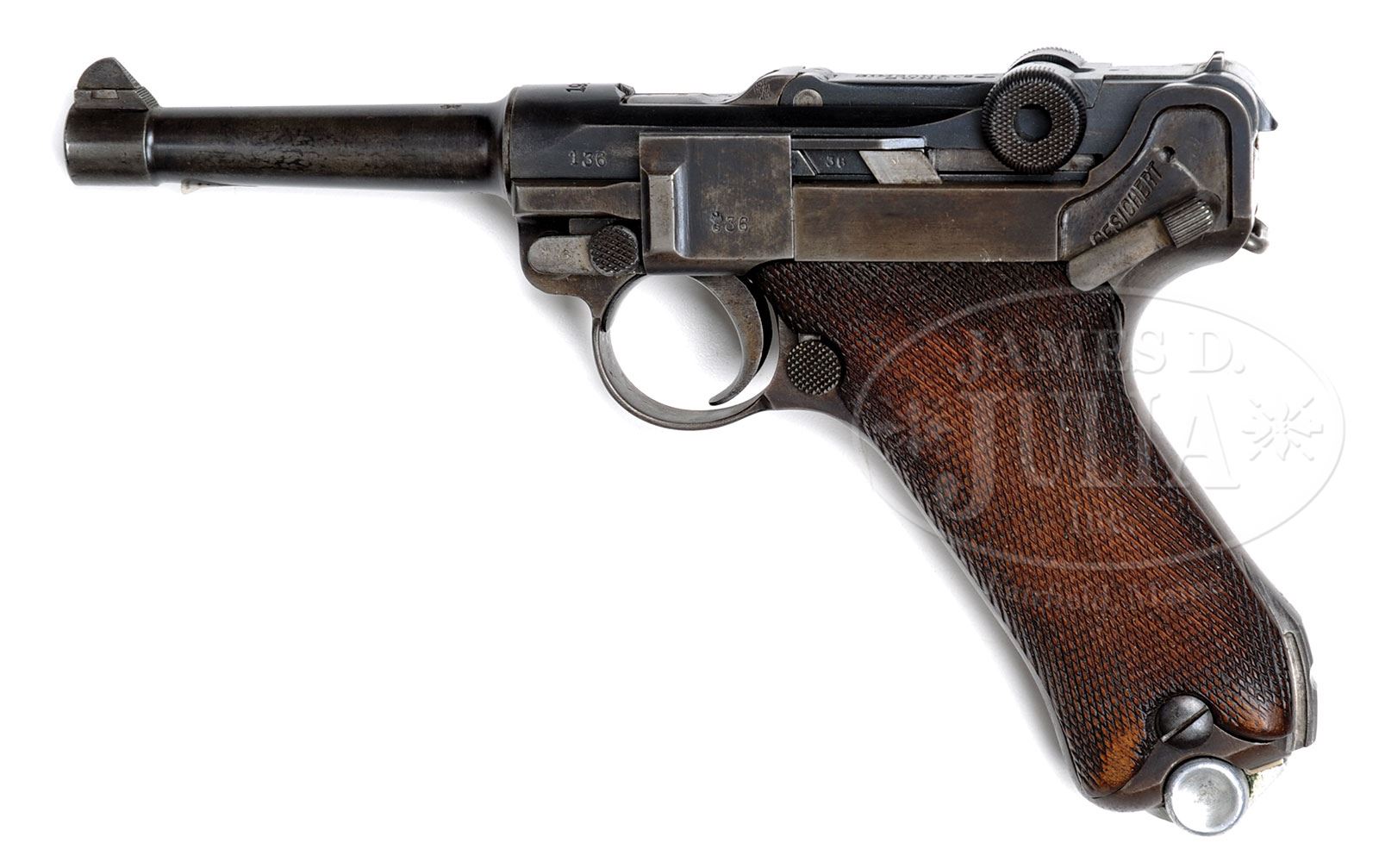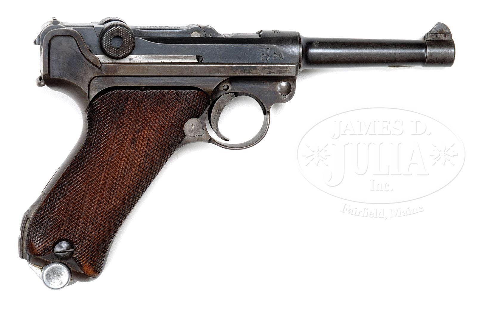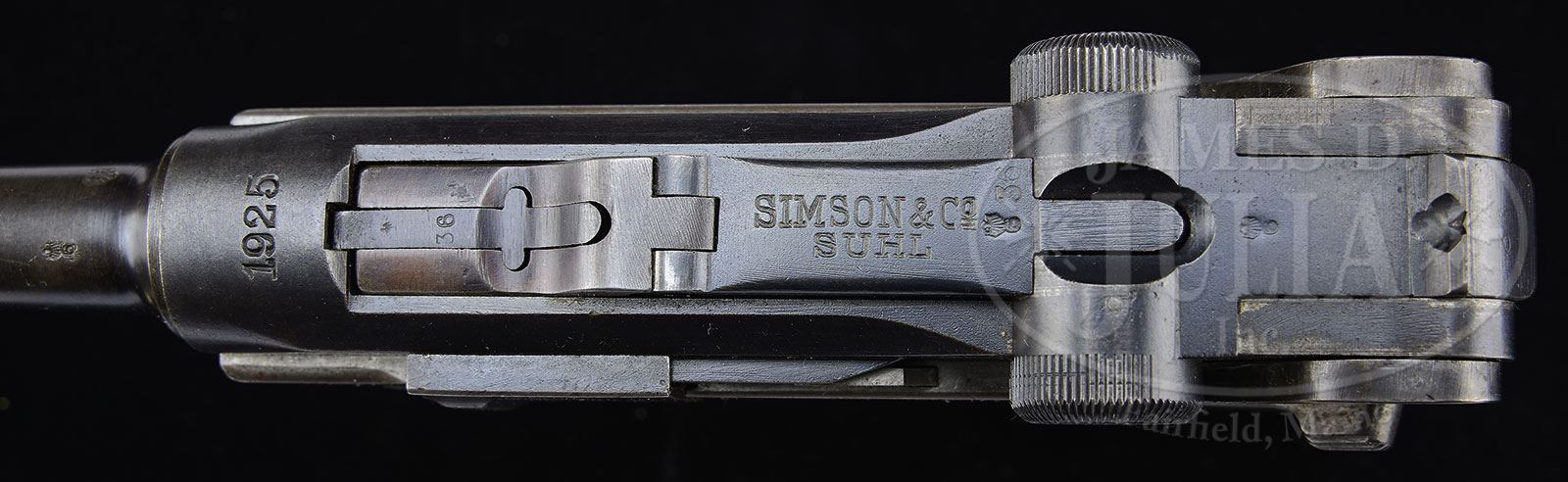 *◊ RARE UNIT MARKED SIMSON 1925 DATE LUGER PISTOL.SN 136. Cal. 9mm 4″ bbl with SN on bottom and Eagle & Eagle/6 proofs on top. 1925 date above chamber. “SIMSON & Co/SUHL” on center toggle link. Eagle/6 proofs on all parts. Front grip strap is unit marked “Kdt r. H. 8.” (Kommandantur-Hannover, weapon number 8). All numbered parts on gun are matching including the checkered walnut grips. Proper 3-digit Simson Eagle/6 proofed magazine with numbers that do not match. This gun is featured on pgs 723, 1156 of The Borchardt & Luger Automatic Pistols by Joachim Gortz & Dr. Geoffrey Sturgess. PROVENANCE: Collection of Dr. Geoffrey Strugess. CONDITION: Fine retaining 85% blue. Blue is thinning overall and is worn bare on grip straps. Straw is 20% with light corrosion. The front tip of the ejector is broken off. Grips are worn and retain some original color. Bore has light wear and frosting. Magazine is excellent with very little wear. Mechanics are fine. 4-52941 (2,500-4,000) – Lot 2291
