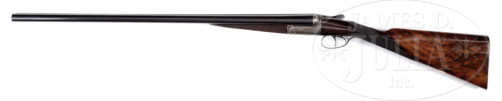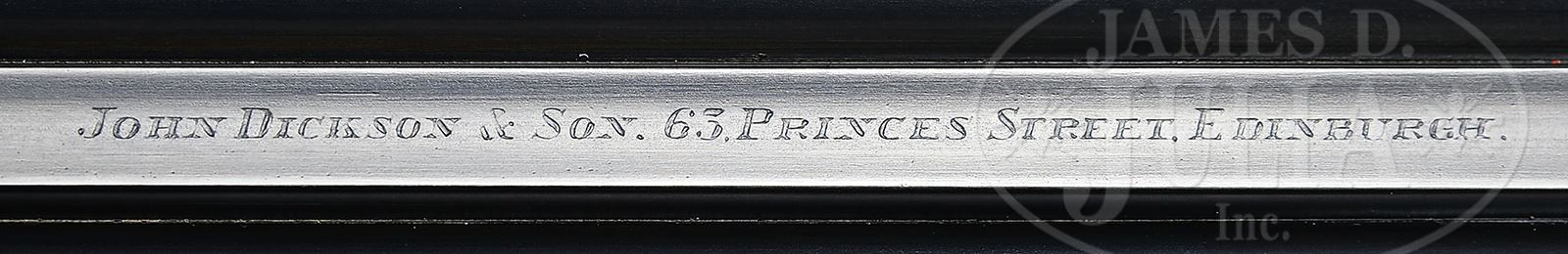 *CLASSIC DICKSON ROUND ACTION GAME GUN.SN 5622. (1904) Cal. 12 ga. 2-1/2″ Chambers. 29″ Bbls have been expertly and almost invisibly sleeved, and are fitted with narrow, concave game rib engraved “John Dickson & Son 63 Princes Street. Edinburgh”. “1” is engraved at rear portion, and also engraved on top lever, and inlaid in silver on central diamond of forend. (Factory records indicate that this gun was paired with gun “5702” ten months later.) Bottoms of bbls are stamped with London nitro proofs at 3 tons and for 2-1/2″ chambers. Case hardened, slim, round bodied, trigger plate, ejector action features automatic safety (SAFE gold inlaid), pivoting third bite, and double triggers. Action is engraved with classic rose and scroll, as usually executed by Jack Sumner. “John Dickson & Son” is on each side. Scroll engraved top lever and trigger guard are blued. SN is at grip. Nicely marbled European walnut straight grip buttstock measures 14-5/8″ over checkered wood butt, and features diamond hand, standard point pattern checkering with mullered borders, and gold oval on toe line engraved “W. M. L”. Matching splinter forend has Anson release. Bore diameter: left -.731, right -.731. Bore restrictions: left -.018 (mod), right -.010 (IC). Wall thickness: left -.025, right -.026. Drop at heel: 2-1/16″, drop at comb: 1-3/8″. Weight: 6 lbs 3 oz. LOP: 14-5/8″. CONDITION: Excellent, as refurbished. Bbls retain nearly all of a satin rust blue, most likely applied at time of sleeving. Engraving slightly softened. Action retains over 80% of a sympathetic color re-hardening, again engraving slightly softened. Top lever and trigger guard retain nearly all of their re-blue. Stocks retain over 90% of a hand rubbed oil finish with several light marks, a few a bit deeper, wood slightly below metal, checkering re-cut. Bores are excellent with one or two small dents. Action is tight. Bbls are on face. Right ejector will not set. All in all, a good shootable Dickson, given a new lease on life with a well done sleeving job. 49305-10 MGM125 C&R (6,000-9,000) – Lot 2291