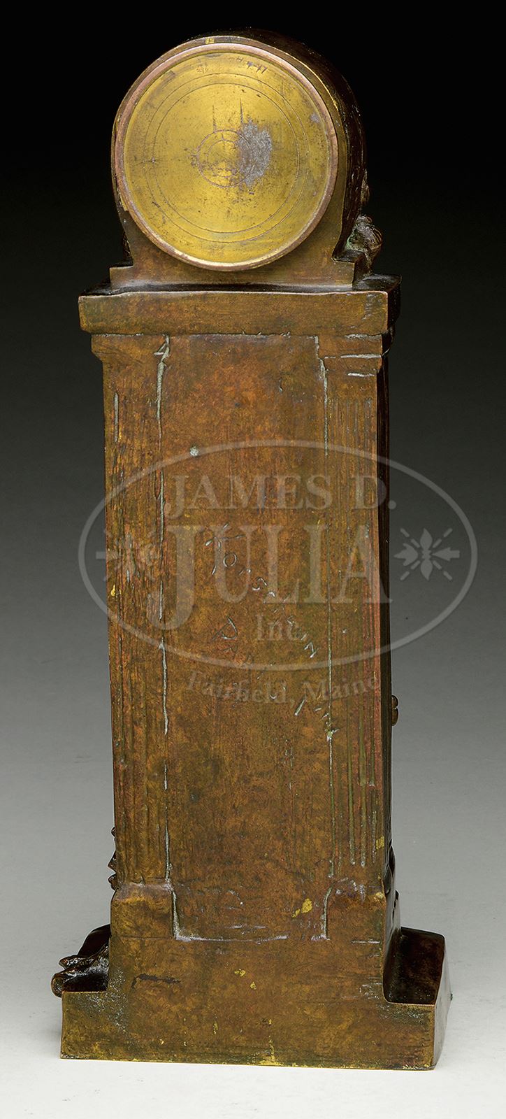 ART NOUVEAU BRONZE CLOCK.Figural cast bronze case with nude maiden with her hand covering mouth of cherub’s face to stop flow of water from spigot. Maiden, cherub and water has gilt finish, while rest of clock case has rich brown patina. Clock has green enameled face with gilt Arabic numerals. Signed on back “Korschann Paris 97”. Complete with key. SIZE: 12-1/2″ t. CONDITION: Very good to excellent with some minor wear to patina. 50429-122 (2,000-4,000) – Lot 2292