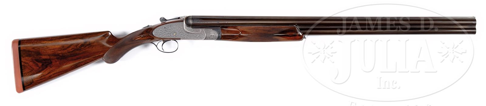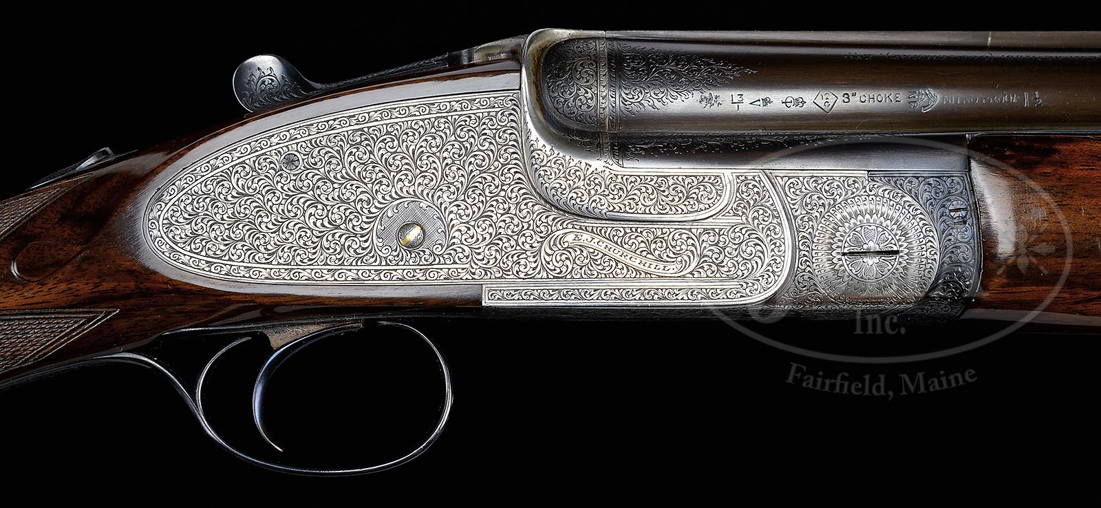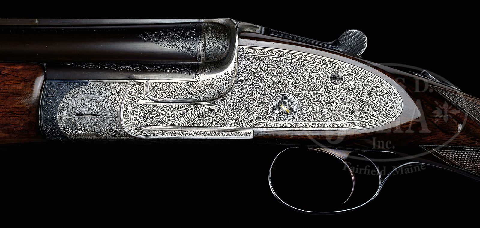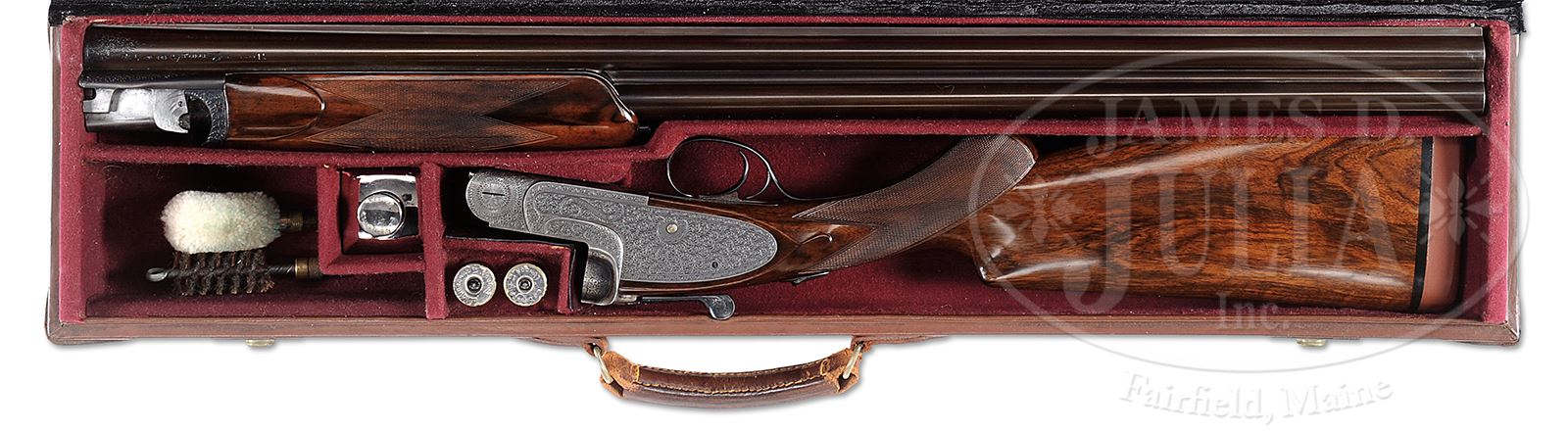 *SCARCE E. J. CHURCHILL PREMIERE PINLESS SIDELOCK EJECTOR SINGLE TRIGGER “WOODWARD PATTERN” OVER-UNDER HEAVY GAME GUN WITH CASE.SN 3851. (ca 1927) Cal. 12 ga. 3″ Chambers. 28″ Demi-bloc bbls fitted with solid, matted, flat rib are engraved “E. J. Churchill. (Gunmakers). Ltd” and “39 To 42. Leicester Square. London. England.” on top bbl either side of rib. Breech end of top bbl has 1″ triangles of well cut shaded scroll. Ejector bosses and forend housing are also scroll engraved. Bottom of bottom bbl is stamped with London nitro proofs for 3″ chambers and “CHOKE”. Robust, case hardened, low profile OU action with trunnions similar to the Woodward OU, is stocked to the fences and fitted with Churchill’s pinless sidelocks. Action features automatic safety (SAFE inlaid in gold), gold band tumbler end cocking indicators, and single non-selective trigger. Action is engraved with complete coverage of medium and small well cut shaded scroll with scroll borders. “E. J. CHURCHILL” is in scroll terminated riband on each lockplate. “The – PREMIERE – Quality” is inlaid in gold on bottom of action. Top lever, trigger plate, and double beaded trigger guard are also scroll engraved. SN is at grip. Well marbled and lightly figured European walnut round knob pistol grip buttstock measures 14-5/8″ over reddish brown Decelerator pad. Stock features drop points, point pattern checkering with mullered borders at grip, and individual gold initials “NS” inlet on toe line. Matching small ejector forend has Anson release. Bore diameter: top -.730, bottom -.730. Bore restrictions: top -.032 (full), bottom -.032 (full). Wall thickness: top -.018, bottom -.022. Drop at heel: 2-1/2″, drop at comb: 1-1/2″. Weight: 8 lbs 5 oz. LOP: 14-5/8”. What appears to be orig makers VC leather case with stitched leather corners is gold embossed “NORMAN SLADE” on top. Interior is lined in burgundy cloth, and has Churchill’s unique celluloid labels in lid. Case contains a pair of Churchill marked snap caps, Churchill marked square oil bottle, as well as a mop and brush. PROVENANCE: Copy of Rendcombian Society Newsletter, mentioning Mr. Slade, under “old news” where it states “Norman Slade (1929-36) writes to say that he was in the Sudan 1942-55, with military and civil medical services, and is now a consultant urologist with Bristol hospitals.” A listing of Churchill gun numbers. CONDITION: Very fine, as partially refinished. Bbls retain nearly all of a London quality re-black, with some slight subsequent silvering, engraving still clear. Case hardening of action is mostly faded to a pleasing silver gray with a considerable amount of color still left where protected by fence. Top lever, forend iron, trigger plate and trigger guard have been re-blued, and retain nearly all of that blue. Stocks have a glossy refinish over a number of marks and scratches, and retain nearly all of that finish. Pad is relatively new. Checkering correctly re-cut. Bores are excellent, with no noted dents. Action is tight. Bbls are very slightly off face. Ejectors are strong and in time. Trigger works. Case leather is still mostly light in color, darkened on edges with chipping and rubs, mostly on edges and corners. Handle is good. Interior cloth is very good with areas patched with leather where rubbed through, lightly soiled. Accessories are good. Snap caps show lots of wear and tear. An unusual heavy proof British OU. 49183-28 MGM33 (15,000-25,000) – Lot 2293 Click here to view provenance