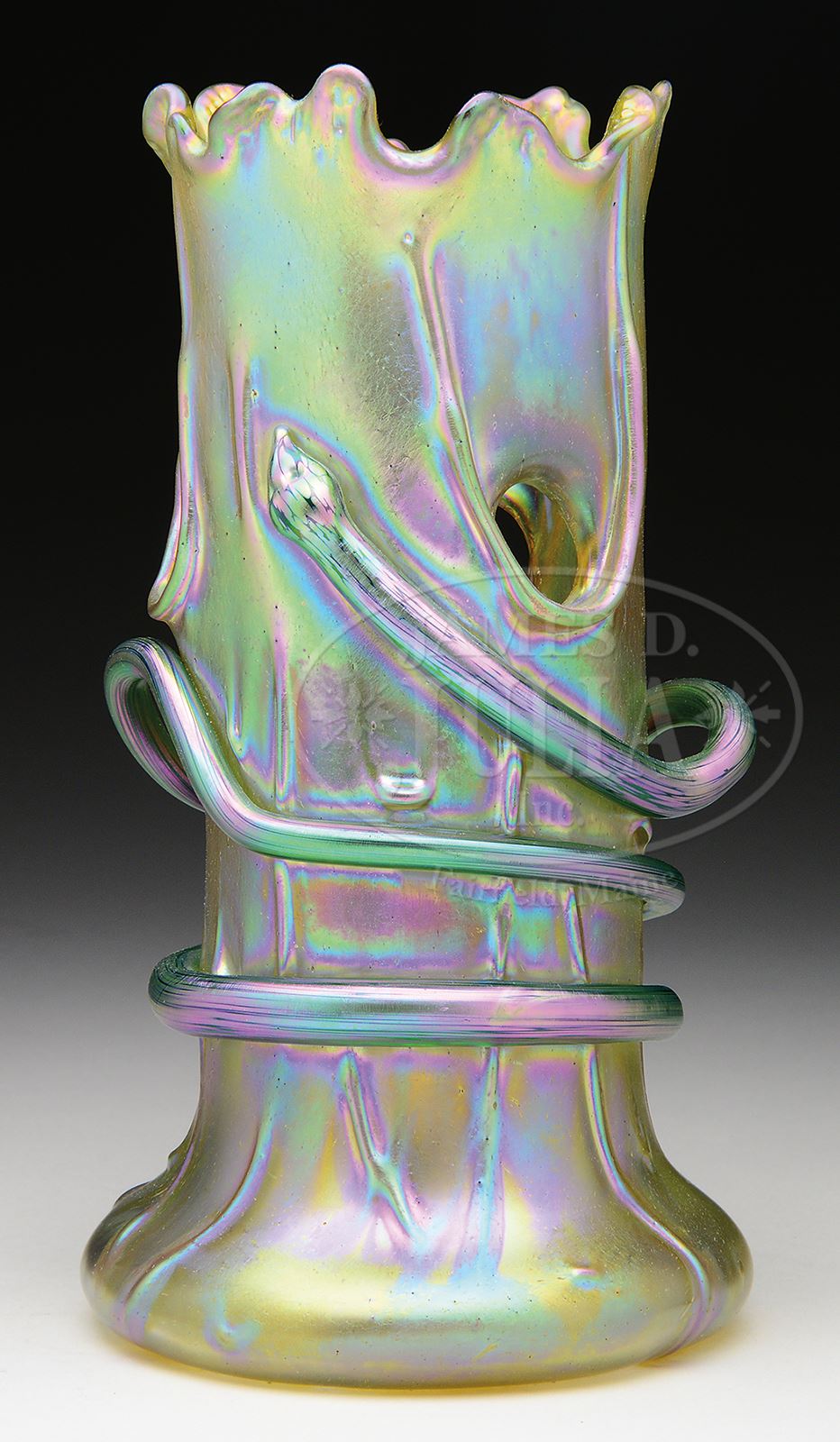 LOETZ DECORATED TREE TRUNK VASE.Loetz vase has tree trunk form body with applied green glass snake encircling side of vase. Snake and vase are finished in rich gold iridescence with strong pink, green and blue highlights. Unsigned. SIZE: 10-1/4″ t. CONDITION: Very good to excellent. 50354-4 (1,800-2,400) – Lot 2293