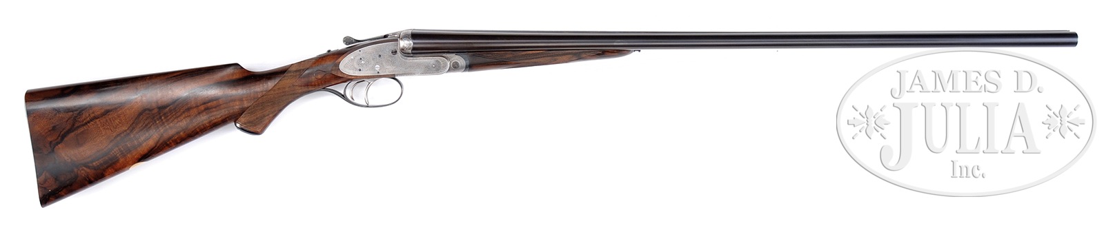 *FINELY REFURBISHED 20 GAUGE HEAVY PROOF PURDEY SIDELOCK EJECTOR GAME GUN WITH ORIGINAL CASE AND ACCESSORIES.SN 21171. (1914) Cal. 20 ga. 2-3/4″ Chambers. 29″ Whitworth steel chopper lump bbls, are engraved with Purdey name and Audley House London address, and with steel information on narrow, concave game rib. Bbl flats are stamped with London nitro proofs for long chamber (LC) and 15/16 oz of shot. Bottoms of bbls are stamped with SNs and choke, along with bbl makers initial “W” (Either Joe Watts or Arthur Wilkes). Tube nos 49109 and 49110 are on loop. Small sized Beesley patent self-opening sidelock action features automatic safety (SAFE inlaid in gold), hidden third fastener, side clips, bushed strikers, raised rib tumbler end cocking indicators, and dbl triggers (front articulated). Action is engraved in Purdey house style rose and scroll. “J. Purdey & Sons” and “London” are on bottom of action, and “J. Purdey & Sons” is on each lockplate. Blued top lever and trigger guard are also scroll engraved. Trigger guard has unusual long swept tang into “Prince of Wales” grip, which extends to small ebony grip cap. SN is on tang. Exceptional well figured and marbled European walnut capped pistol grip buttstock measures 14-5/8″ over checkered wood butt, and features classic point pattern checkering, drop points, and a vacant silver oval on toe line. Matching splinter ejector forend has Anson release, and iron is stamped with actioners initials “J.T” (Joe Thompson). Bore diameter: left – .615, right -.615. Bore restrictions: left -.032 (full), right -.013 (Mod). Wall thickness: left -.036, right -.034. Drop at heel: 2-5/8″, drop at comb: 1-7/16″. Weight: 6 lbs. 4 oz. LOP: 14-5/8″. Orig makers oak and leather case with brass corners and circular central medallion is lined in scarlet cloth. Small Purdey paper label and charge card for this gun, are affixed to lid. Case contains an assortment of old and new accessories including Boss marked horn handled chamber brush, unmarked round pewter oil bottle, along with another round oil bottle, some brass and ebony loading equipment, and bone striker bottle marked for this gun with spare strikers and lock screws. New accessories include a Purdey marked pull-through field cleaning kit, brass and composition snap caps, striker key, horn handled turnscrews, and another pair of Purdey marked snap caps. Cleaning equipment includes a 2-pc walnut and brass cleaning rod with short handle with brush, mop, and turks head. Also included is another interesting accessory, a small EC Powder Company game record booklet, stamped with Purdey name and address on fly leaf. PROVENANCE: 1911 edition INSTRUCTIONS FOR PURDEY GUNS inscribed with info for this gun. Factory email confirming specifications of this gun, and stating that it was restocked in 1940; Purdey factory letter stating same. Various invoices and letters from noted, but now deceased, gunsmith Alfred Gallifent, and ex-Purdey stocker Paul Hodgins, listing work performed, including restocking, new action guard and cap pins, re-blacking bbls, new cross pin, and re-joint, fitting new drop, etc. Consignors notes. Lifelong Collection of Gentleman Collector Herbert Hyatt. CONDITION: Excellent, as partially refurbished. Bbls retain essentially all of a London quality rust blue, engraving picked up. Action and lockplates retain traces of orig case hardening color, engraving on fences picked up. Engraving has been cleaned up on trigger guard, which retains nearly all of its new charcoal blue. Exceptionally fine newly made (2005) stocks by Paul Hodgins, retain essentially all of their hand rubbed oil finish, with a few scattered light marks, checkering slightly darkened. Bores are excellent, slightly frosted. Action is tight. Bbls are on face. Ejectors are in time. Drop is excellent. Case leather is fine, with some darkening and marks. Newer straps and handle are fine. Orig interior cloth is very good with some compressions and soiling. Both labels are heavily foxed and oil soaked. Old accessories are fine, newer accessories are excellent. A fine small bore Purdey reconditioned by some of the best in the business. 49896-6 MGM45 (20,000-30,000) – Lot 2294 Click here to view provenance