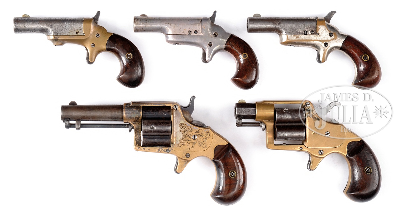 SUPERB LOT OF FIVE COLT DERINGERS AND CLOVERLEAF REVOLVERS.1) COLT 3RD MDL DERINGER. SN 1082. Cal. 41 RF. Colt 3rd model Deringer with raised style frame. 2-1/2″ bbl with 2-pc walnut grips. Brass frame with blade front sight. PROVENANCE: The Estate of G. W. “Bill” Stewart of Sonora, Texas. CONDITION: Very good overall, with traces of silver wash finish on frame in protected areas. 2-pc walnut grips are good overall with one crack in right grip but suffering no material loss. Early raised frame with no markings other than SN under grip. Bbl has evidence of light corrosion and is now void of finish other than some light spotting. 2) COLT 3RD MDL DERINGER. SN 7612. Cal. 41 RF. Colt 3rd model Deringer. 2-1/2″ bbl. 2-pc walnut grips with silver plated finish. PROVENANCE: The Estate of G. W. “Bill” Stewart of Sonora, Texas. CONDITION: Very fine as refinished, with good mechanics and dark bore. Most all of the silver remains with slight tarnish and very slight finish loss at muzzle and underside of bbl. 3) COLT 3RD MDL DERINGER. SN 15286. Cal. 41 RF. Colt 3rd model Deringer with 2-12″ bbl, 2-pc walnut grips with nickel finish overall. Late variation with flat frame and marked “41 Cal” on left side of frame. Blade front sight with “COLT” on top of bbl. PROVENANCE: The Estate of G. W. “Bill” Stewart of Sonora, Texas. CONDITION: Very fine overall, with good bore and mechanics. Grips are very nice with no cracks, chips or material loss. Much nickel finish remains on frame and lesser amount on bbl. 4) COLT CLOVERLEAF. SN 578. Cal. 41 RF. Colt cloverleaf revolver with 3″ bbl and 2-pc select walnut grips. Blue bbl and cyl with silver washed frame over New York style engraving. Nitre blue hammer and spur trigger with proper ejector. 3 digit SN, 1st year manufacture 1871. PROVENANCE: The Estate of G. W. “Bill” Stewart of Sonora, Texas. CONDITION: Exceptionally fine overall, with much factory silver wash remaining on frame and most high polished blue on cyl. Bbl has blue in protected areas. Balance has turned plum. Select walnut grips are very fine with no cracks, chips or distress. Bore and mechanics are excellent. A very difficult gun to find in this condition. 5) COLT CLOVERLEAF. SN 2190. Cal. 41 RF. Colt cloverleaf revolver with rare oct 1-1/2″ bbl. 2-pc walnut grips. 1st year manufacture 1871. 4-shot cloverleaf cyl with ejector and blade front sight. An exceptionally scarce variation. PROVENANCE: The Estate of G. W. “Bill” Stewart of Sonora, Texas. CONDITION: Very fine overall, with much blue finish remaining. Walnut grips are very fine with no cracks, chips or material loss. Bore and mechanics are very fine. Left sideplate shows slight period damage and brass frame has mellowed to a nice even patina. 49973-178, 49973-178, 49973-179, 49973-180, 49973-201, 49973-202 TDW (5,500-7,500) – Lot 2295