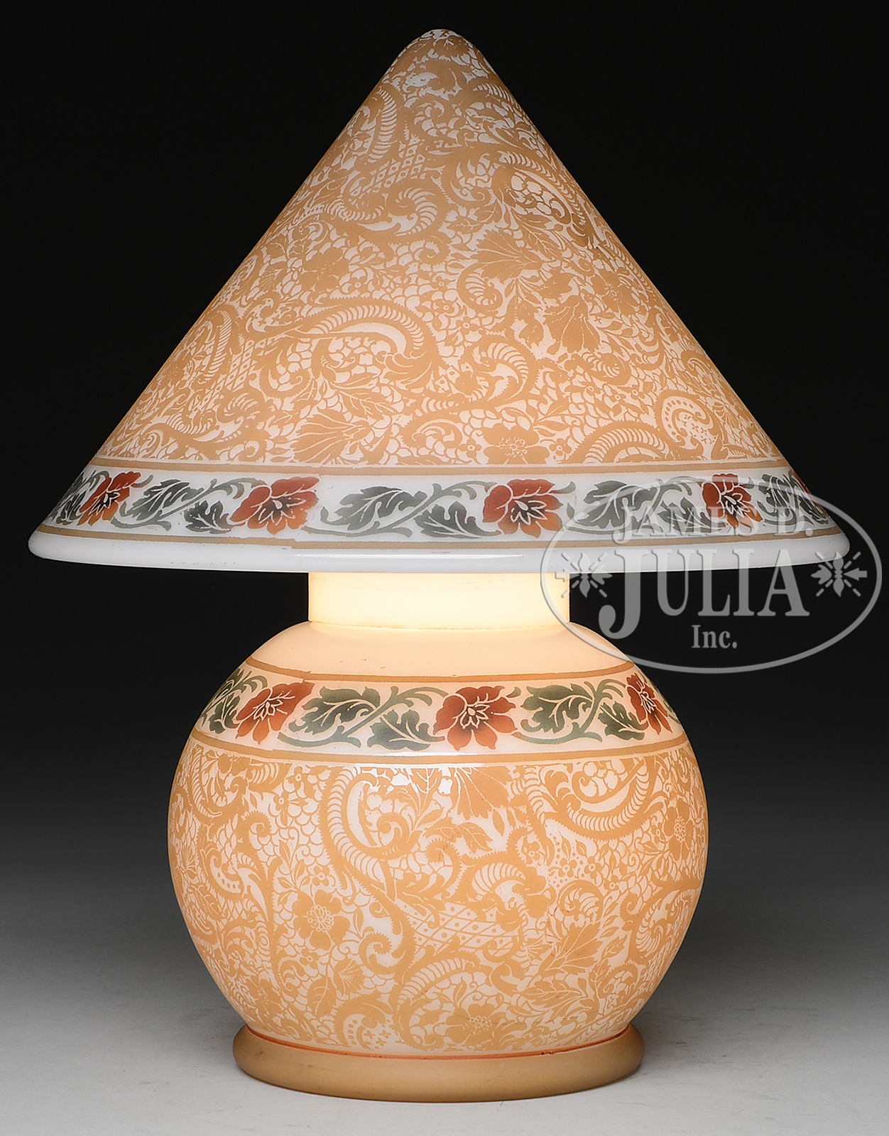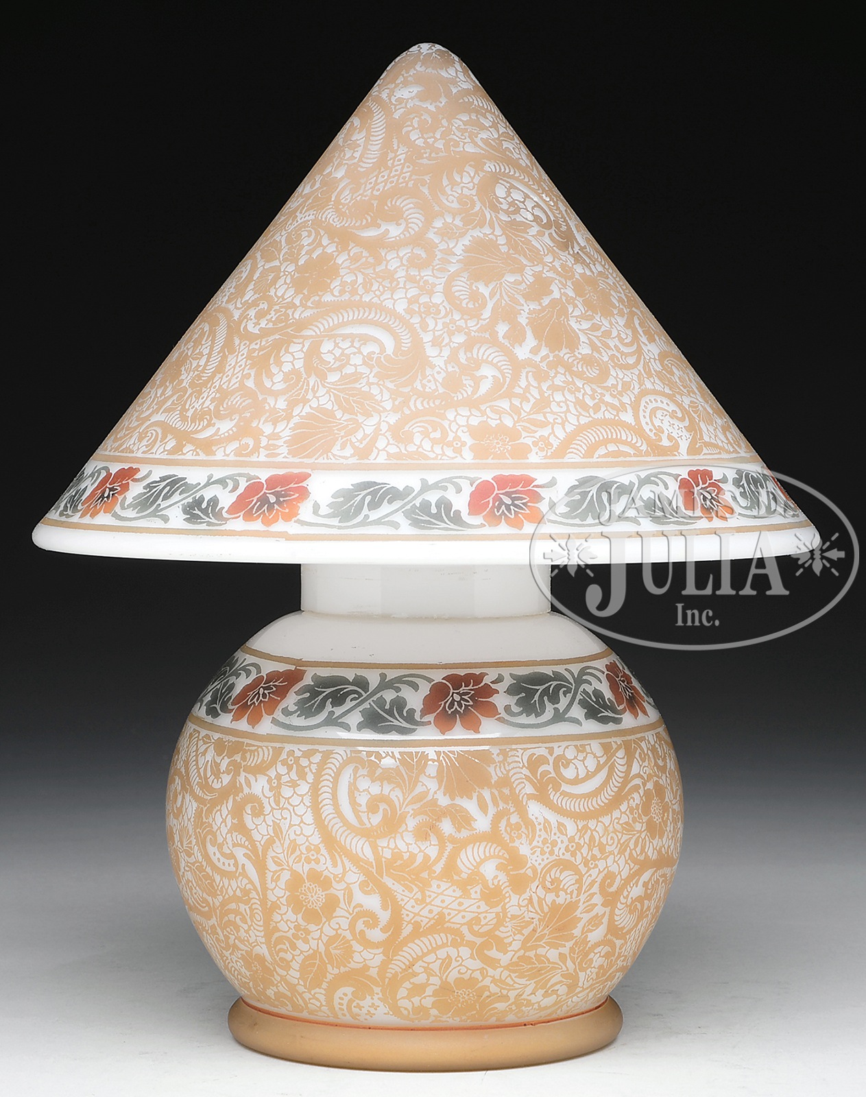 BELLOVA GNOME LAMP.Bellova lamp is acid-etched with gold flowers and scrolls surrounding the body and shade. Gold decoration is bordered by a band of red flowers with stylized green leaves and stems. All set against a white milk glass background. Marked on the underside “Czechoslovakia CZ 1805”. SIZE: 9-3/4″ t. CONDITION: Very good to excellent. 5-69018 (500-800) – Lot 2297