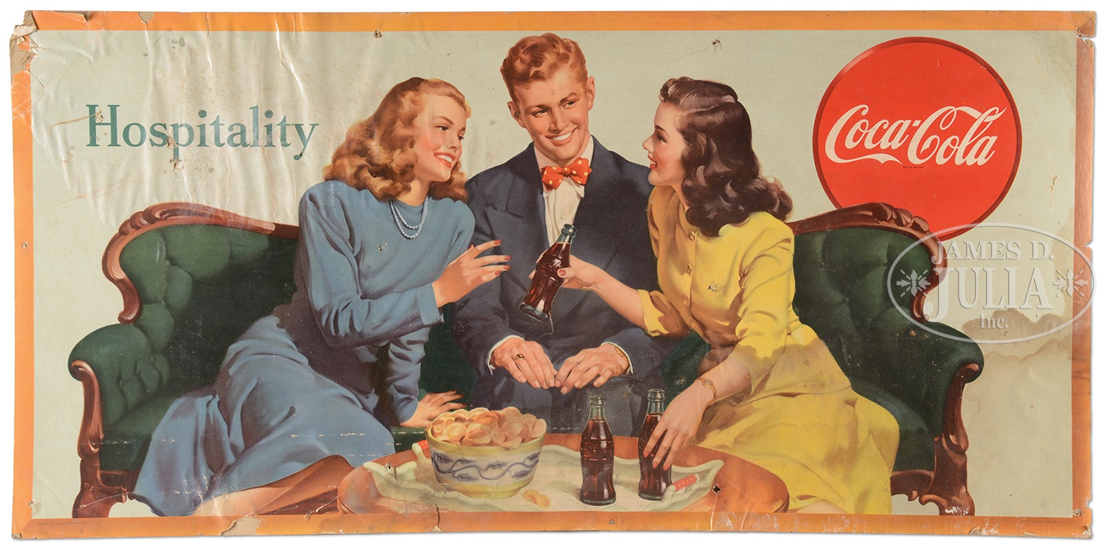 PAIR OF LARGE COCA-COLA ADVERTISING SIGNS TITLED “HOSPITALITY”.These illustrate a young man on a Victorian sofa being entertained by two lovely maidens offering him Coca-Cola. SIZE: Approx 55″ w x 27″ h. CONDITION: Each are stained with some losses, wrinkles and each having at least a couple of puncture wounds. 49103-5 (200-400) – Lot 2297 Auction: Advertising, Toy & Doll - Spring 2015 Please Note: All prices include the hammer price plus the buyer’s premium, which is paid by the buyer as part of the purchase price. The prices noted here after the auction are considered unofficial and do not become official until after the 46th day. |
