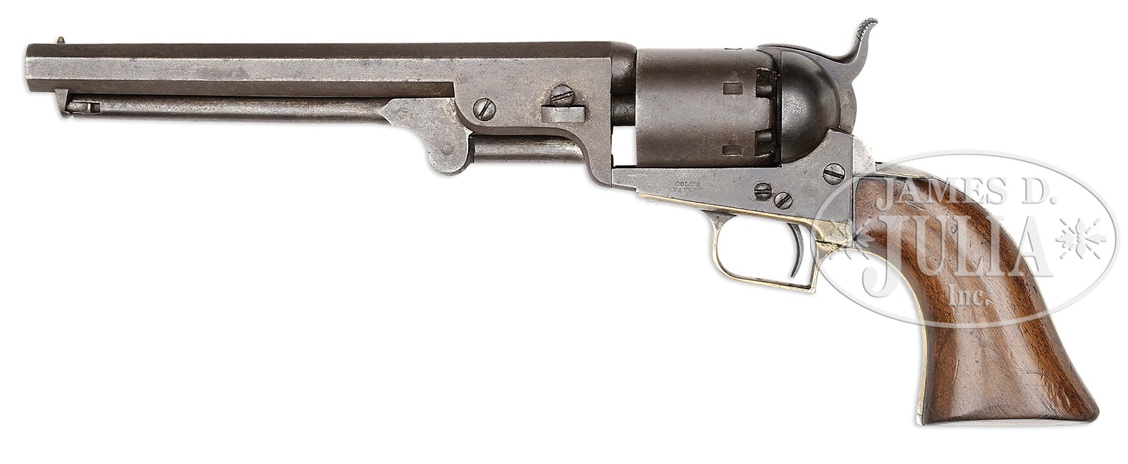 RARE AND HISTORIC SQUARE-BACK COLT NAVY REVOLVER INSCRIBED TO STEPHEN R. MALLORY.SN 1705. This rare early Colt Navy was made in the first year of production 1850.It is in impeccable “as found” condition with impeccable provenance as descending in the family of Stephen R. Mallory. The gun is inscribed on backstrap in the style most likely attributed to the Colt factory “HON. STEPHEN R. MALLORY, KEY WEST”. Mallory has a long and illustrious record of political service, most famously known as the Confederate Secretary of the Navy under President Jefferson Davis March 4, 1861 – May 2, 1865. Mallory served in many posts prior to and after the Confederacy. He was elected Senator from the state of Florida in 1850 which is no doubt the date and reason for him owning this early Colt Navy revolver. Col. Colt gave many guns to political figures he thought could further sales of his guns. Mallory, in his time in the Senate, was the prominent Chairman of the Committee on Naval Affairs. This was a time of rapid Naval reform and he insisted that ships of the United States Navy should be the best in the world. Mallory was born in Trinidad, British West Indies in 1812. His family moved to the United States and settled in Key West, Florida in 1820. He joined the army and fought in the Seminole War in Florida, 1835-1837. Mallory held several minor political posts until becoming Senator in 1850; a post he held until secession in 1861. There is much written and published on Mallory’s thoughts on the Navy in this time frame. After the Civil War Mallory was imprisoned along with Jefferson Davis and was among the few in the Confederate Government to be charged with treason against the United States. It was not until March 10, 1866 that President Andrew Johnson granted Mallory a “partial parole”; though Mallory was no longer in jail, he was required to stay with his daughter in Bridgeport, CT. It was not until June of 1866 that Mallory was paroled and allowed to return to Florida. By the terms of his parole he was not permitted to hold public office. He practiced law in Pensacola until his death in 1873 and is buried at St. Michael’s Cemetery in Pensacola. It is interesting to note that among Mallory’s published thoughts on modernizing the Navy that rifled guns (especially cannon) should replace smooth-bore weapons. Colt Navy revolvers would have Naval military contracts in the 1850s, replacing smooth-bore, single shot pistols then in Naval inventories. This gun has impeccable surface and inscription to Senator Mallory and is mentioned specifically in a 1977 will to family member of consignor. PROVENANCE: Stephen R. Mallory, Stephen R. Mallory Descendents. CONDITION: Gun is very good overall. Gun appears orig and authentic and unaltered. SN 1705 appears on all parts normally serial numbered with exception of wedge which is numbered 789 but appears orig to this gun with identical surface and patina. There are small traces of org finish in protected areas though surfaces are brown/plum with staining and pitting. All serial numbers are well struck and easily discerned. Address on bbl is complete though several letters are weakly struck as can be seen in photos. ‘COLT’S PATENT’ on left side of frame is discernible but a couple letters light as can be seen in photos. The rolled Naval battle cylinder scene is about 50% discernible and light. About 25% of the silver plating on backstrap and trigger guard is retained. The inscription on backstrap is well discerned and easily read. The well-fit wood grips retain about 90% of their orig varnish with scattered, small dings, dents and scratches. 4-49112 JS (20,000-30,000) – Lot 2298