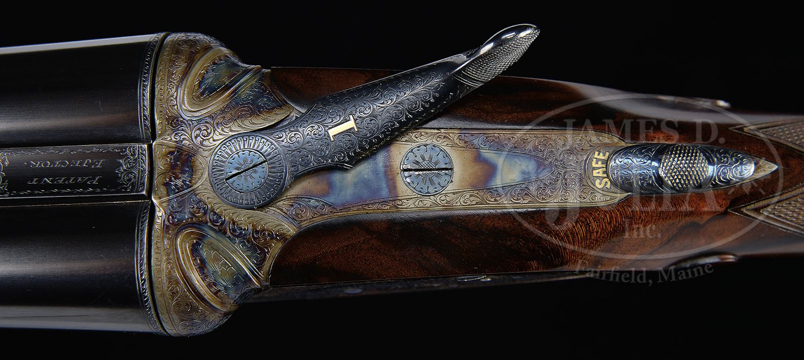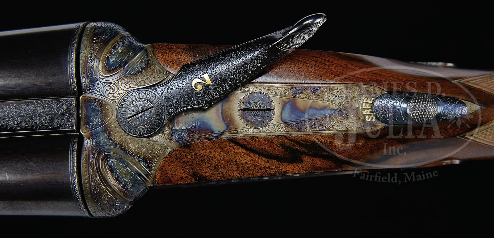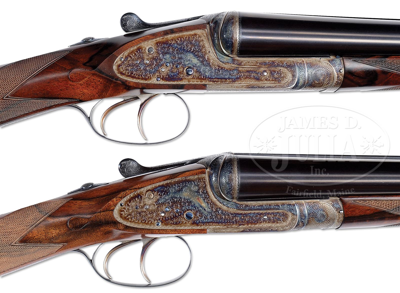 *MATCHED PAIR OF SUPERBLY REFURBISHED STEPHEN GRANT SIDELOCK EJECTOR GAME GUNS WITH CASE.SN 8044/ 8045. (1919) Cal. 12 ga. Starting with a fine orig pair of actions, these great guns have been completely refurbished and now sport new bbls and stocks, as well as complete refinishing and rebuilding of mechanisms. Many of these guns were done by Ken Duglin when he was proprietor of Atkin, Grant, and Lang. These guns have new beautifully struck 30″ chopper lump bbls, gold inlaid “1” and “2” toward centers of narrow game ribs. (“1” and “2” are also gold inlaid on top levers and forend tips.) Tops of bbls are engraved “Stephen Grant & Sons.” and “7. Bury Street. St. James’s London.” on tops. Bbl flats are stamped with 2001 London nitro proofs for 2-3/4″ chambers. SNs are stamped on bottom of bbl of gun “1”, and engraved on bottom of bbl of gun “2”. Case hardened bar lock sidelock actions feature automatic safeties (SAFE gold inlaid), bushed strikers, and double triggers. Actions are nicely filed with fillets and beads, and Stephen Grant’s classic fluted fences. Actions and lockplates are engraved with nearly full coverage well cut medium and small scroll with acanthus on flutes. “Stephen Grant & Sons” is on each lockplate. Best London new stocks are of exceptionally fine dark veined and lightly figured European walnut (buttstock of gun “2” is somewhat lighter in color). Stocks feature straight grips, checkered wood butts, classic drop points and checkering, and gold ovals on toe lines engraved “L.C”. Matching splinter ejector forends have Anson releases. Gun no. “1”: Bore diameter: left -.725, right -.725. Bore restrictions: left -.022 (mod), right -.013 (lt mod). Wall thickness: left -.032, right -.032. Drop at heel: 2-5/16″, drop at comb: 1-1/2″. Weight: 6 lbs 12 oz. LOP: 14-3/4″. Gun no. “2”: Bore diameter: left -.724, right -.725. Bore restrictions: left -.024 (mod), right -.012 (lt mod). Wall thickness: left -.035, right -.033. Drop at heel: 2-1/4″, drop at comb: 1-1/2″. Weight: 6 lbs 13 oz. LOP: 14-3/4″. Note: guns are “cast on” approx 1/2″. Best quality oak and leather two-gun case with brass corners and circular central medallion, is in brown canvas outer cover with tan leather trim. Central panel on top is embossed “L. C.” Case is lined in scarlet cloth with Grant paper label with Broomhill Leys, Windmill Road address. Case contains 2-pc black composition and brass cleaning rod with mop, brush, and jag in leather wallet, Atkin, Grant and Lang marked square oil bottle, and 2 marked pairs of AGL snap caps. Covered compartment with brass knob holds the key. CONDITION: Exceptionally fine as completely factory re-conditioned with new bbls and stocks. Guns retain essentially all “best” finishes on wood and metal, with just a hint of silvering on action beads, thumbpieces, and sides of trigger guard bows. Bores are excellent. Actions are tight. Bbls are on face. Ejectors are strong and in time. Case is excellent, near new in all respects. A lovely pair of guns ready for another century of enjoyment. 49305-5 MGM191 (26,000-36,000) – Lot 2298