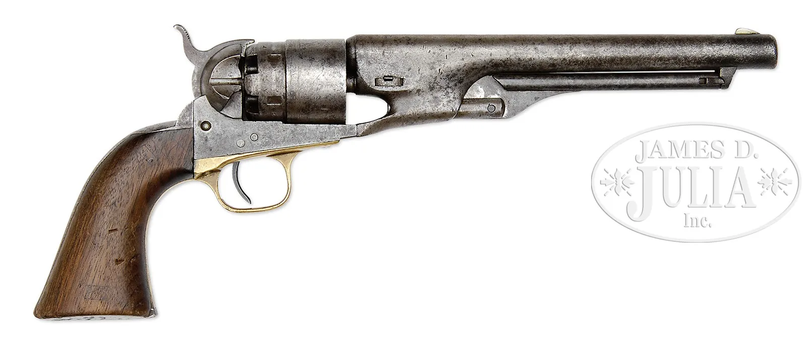 HISTORIC COLT M-1860 PERCUSSION ARMY REVOLVER ATTRIBUTED TO PVT. JOESPH N. HAWKINS CO D CUSTER’S 7TH MICHIGAN CAVALRY.SN 77460. Standard 44 cal. Colt Army revolver all matching, orig and complete with exception of replaced wedge screw which has been identified as issued to Co D 7th MI volunteer cavalry through the Springfield Research Service vol 4 1995 edition. In addition there is a signed letter from Franklin B. Mallory Chief Researcher, Springfield Research Service attesting that revolver serial #77460 was found in the company & regimental ledgers for the 7th MI cavalry. These records are stored in the National Archives as record group 94 entry 112 and the specific citation was found in the order books for companies D – M. Pvt. Hawkins enlisted at Grand Rapids on Nov 13, 1862 and died of typhoid fever at U.S. Hospital #1 in Frederick, MD on July 20, 1863 immediately following his service at The Battle of Gettysburg. Pvt. Hawkins was with his regiment in the engagements leading up to and through Gettysburg. On May 29, 1863 the 7th MI and 1st VT cavalry engaged Mosby at Cattlett’s Station and on June 30 he engaged Jeb Stuart’s cavalry at Hanover. At the Battle of Gettysburg Custer’s 7th MI Cavalry was heavily engaged on July 3, 1863. On this day General Custer, in his famous charge with the 7th Michigan Cavalry behind him, is where he shouted those famous words, “Come on you Wolverines!” Hawkins was present with his unit until he contracted typhoid fever and was admitted to the hospital on July 6, dying 14 days later from the disease. In addition to this historic association, the Springfield Research Service documents that Colt Army revolver serial #77460 remained in service with the MI cavalry brigade when it was sent west in August 1865 on Gen. Patrick Connor’s Powder River expedition against the Sioux and Cheyenne Indians. While not inscribed, this historic Colt revolver is solidly documented to Pvt. Hawkins and Custer’s 7th MI Cavalry through the Battle of Gettysburg. The gun is accompanied by the Springfield Research Service documentation, extensive personal documents on Hawkins including his military service record, copies of regimental histories, family tree and image of his grave site. Copies of these are available for perspective buyers. CONDITION: The revolver shows medium to heavy wear with no orig finish remaining. All metal is a medium gray color with light surface pitting here & there. Walnut grips are worn with numerous dings on butt from use as a tack hammer. Wedge screw is replaced. Inspector’s initial remain on metal parts & the gun functions mechanically. An important & historic attributed Colt revolver. 4-51031 (20,000-25,000) – Lot 2299