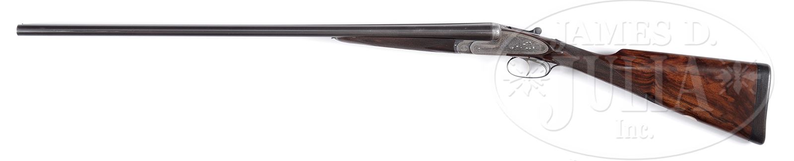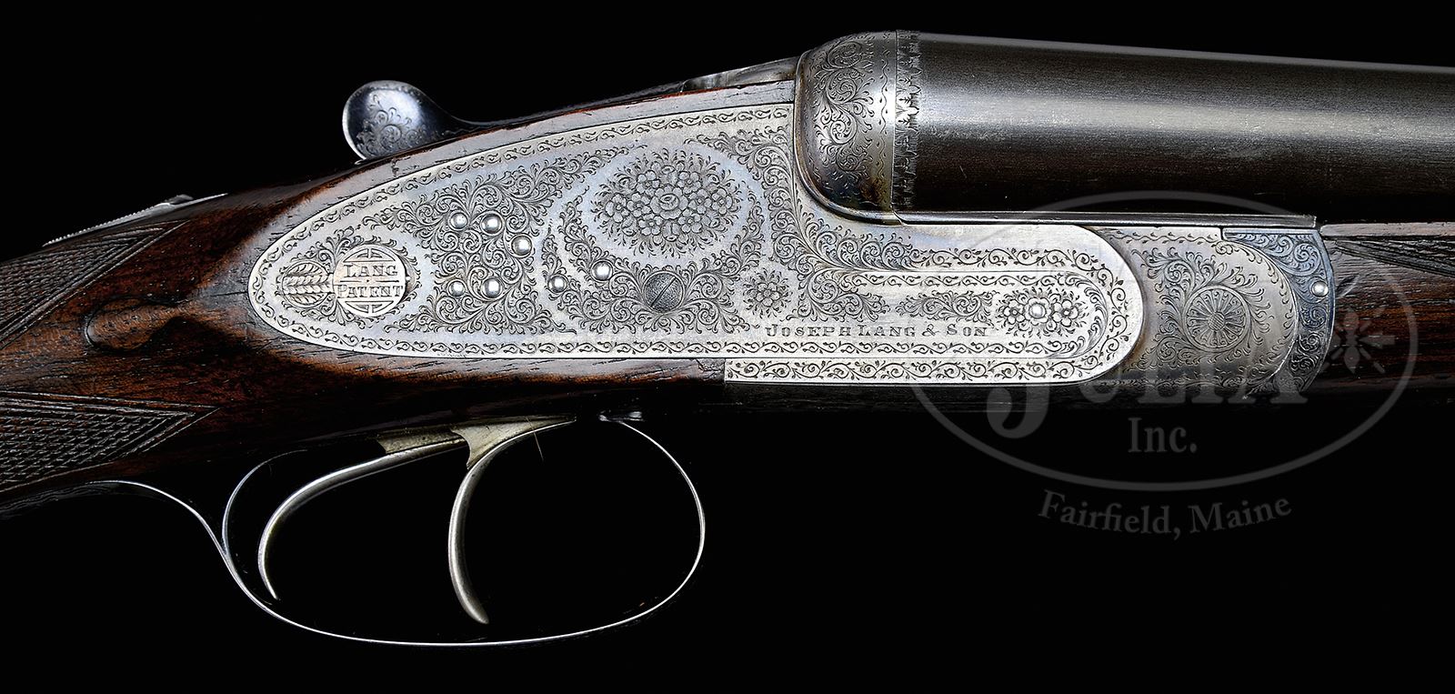 Please Note: Gun was ordered by Abercrombie & Fitch in 1926 as a Single Trigger Gun. Double triggers and new trigger guard added more recently as was truck case. *DAINTY 20 GAUGE JOSEPH LANG SIDELOCK EJECTOR GAME GUN WITH “PATENT TURNING FLAP” HAND DETACHABLE LOCKS WITH CASE.SN 15951. Cal. 20 GA 2-3/4″ Chambers. (Made ca 1920) 28-3/8″ Dovetailed bbls are engraved “Joseph Lang & Son. 7 Bury Street. St. James’s London.” on narrow, slightly swamped game rib, with extension for third fastener. Bbl flats are stamped with London nitro proofs for 7/8 and for 1 oz with “LC” (long chamber) mark. Bottoms of bbls are stamped with SNs and “JL&S”. Scaled down sidelock action is stocked to the fences, and features automatic safety (SAFE engraved on gold rectangle), pivoting third fastener, and double triggers. Locks are fitted with seldom seen Lang’s patented “turning flap” hand detachable feature, with detent depressed with thumbnail allowing door to open. A quarter turn of the door releases locks for removal. It appears this is a predecessor to (but in this catalogers opinion is prior to) Lang’s famous key lock. Action and lockplates are engraved with near full coverage well cut rose and scroll. “Joseph Lang & Son” is on each lockplate. “LANG PATENT” is on each takedown door. Blued top lever and trigger guard are also scroll engraved. SN is at grip. Well marbled European walnut straight grip buttstock measures 14-1/8″ over dark brown leather covered pad. Typical drop points and checkering are at semi-diamond grip. A vacant silver oval is on toe line. Matching splinter ejector forend has Anson release. Bore diameter: left -.617, right -.616. Bore restrictions: left -.011 (mod), right -.006 (IC). Wall thickness: left -.033, right -.026. Drop at heel: 2-9/16″, drop at comb: 1-9/16″. Weight: 5 lbs 11 oz. LOP: 14-1/8″. What appears to be orig leather case with brass corners is embossed “Carlos Quintana FLORIDA 980″ on top. Interior is lined in green cloth with gold embossed brown leather Lang label in lid. Case contains 2-pc walnut and brass cleaning rod and a pair of snap caps. PROVENANCE: ca 1925 Lang catalog with p. 18 describing the detachable lock system, with an add on price of 6 pounds 6 shillings. Larry Baer Estate Collection. CONDITION: Very fine, as partially refinished. Bbls retain most of what appears to be their orig blue, thinned from hand wear and with a few light marks. Action retains 15 – 25% orig case hardening color where protected. Lockplates retain about half of their orig color. Top lever is considerably silvered at thumbpiece, and trigger guard is lightly silvered, after re-blue. Stocks retain a goodly amount of what appears to be their orig finish, with open grain. Butt portion refinished at time of installation of newer pad. Stocks have normal handling marks, checkering is somewhat worn. There is a 1/2” stress crack behind each lockplate, neither flex. Bores are excellent. Action is tight. Bbls are on face. Ejectors are strong and in time. Case leather is fine with numerous scuffs and remnants of some old labels. Newer interior cloth is excellent. Label is excellent with a couple of rubs. 49427-6 MGM276 (8,500-12,500) – Lot 2299 Click here to view provenance