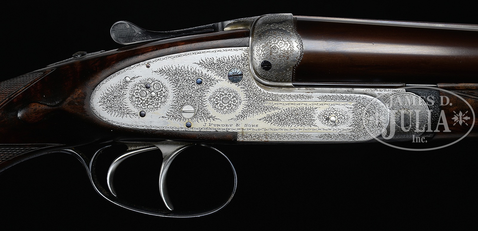 *GOLDEN AGE PURDEY PIGEON GUN WITH CASE.SN 24035. (1930) Cal. 12 ga. 2-3/4″ Chambers. 30″ Chopper lump Whitworth steel bbls are fitted with slightly raised, matted rib, and are engraved with Purdey’s famous Audley House address and steel type, on tops. Bbl flats are stamped with London nitro proofs for 2-3/4″ chambers. Bottoms of bbls are stamped “CHOKE” and with SNs. Bottom of left bbl is stamped with bbl makers initials “JW” (Joe Watts). Tube numbers “59793” and “59794” are on loop. Robust, Beesley patent self-opening, sidelock action features side clips and third fastener, along with non-automatic safety (all typical of pigeon guns). Action also features usual bushed strikers, raised rib tumbler end cocking indicators, and dbl triggers. Action and lockplates are engraved in typical Purdey house style rose and scroll. “J. Purdey & Sons” is on each lockplate, and also on bottom of action over “London”. Blued top lever and trigger guard are also scroll engraved. SN is at grip. Well marbled, and nicely figured European walnut round knob pistol grip buttstock measures 14-1/2″ over black leather covered pad over 1/4″ black spacer. Stock features typical drop points and point pattern checkering at grip. A vacant gold shield (per factory letter) is on toe line. Matching splinter ejector forend has Anson release, and actioners initials “P.W” (Percy Wilkes) on iron. Bore diameter: left – .731, right -.731. Bore restrictions: left -.030 (full), right -.025 (IMod). Wall thickness: left -.030, right -.029. Drop at heel: 2-3/16″, drop at comb: 1-1/2″. Weight: 7 lbs. 8 oz. LOP: 14-1/2″. What appears to be orig makers oak and leather case with brass corners, and round central medallion, is embossed “S. W. C. T.” and “Phila. PA.” on top. Interior is lined in burgundy cloth, and has small gold embossed black leather Purdey label in lid, along with charge card for this particular gun. Case contains old 2-pc ebony and brass cleaning rod with short handle, pair of Purdey marked snap caps, horn handled chamber brush, Purdey marked ebony wad rammer, celluloid Kynoch marked letter opener, horn handled shot dipper, and ebony handled roll crimping tool. Newer accessories include pair of horn handled turnscrews with matching striker key, pair of A&F marked snap caps with matching round oil bottle, and a Purdey bench cloth. A black morocco wallet contains pull through cleaning kit, and bone striker bottle contains pair of strikers. A covered compartment contains mop, jag, brush, and Purdey marked broken case extractor. PROVENANCE: Factory letter with orig specifications. Paul Hodgins invoice for restocking forend. “Purdey Guns” instruction booklet and game record. Consignors notes. Lifelong Collection of Gentleman Collector Herbert Hyatt. CONDITION: Fine, as refurbished. Bbls retain nearly all of a high quality re-black. Action is cleaned to coin finish with engraving picked up. Buttstock retains nearly all of an old shiny oil refinish, worn through from normal hand wear around grip, sharp edges slightly rounded, checkering re-cut. Pad is new. Factory quality replacement forend wood by Paul Hodgins is excellent. Bores are excellent, lightly frosted. Action is tight. Bbls are on face (new hinge pin). Drop is good. Ejectors are strong and in time. Case leather is considerably darkened, has some water stains, and a number of scuffs, rubs, and dings. New straps and handle are excellent. Interior cloth is good with some insect damage, soiling, compressions, and rubs from contact with gun. Accessories are fine. 49896-7 MGM66 (9,000-14,000) – Lot 2299 Click here to view provenance