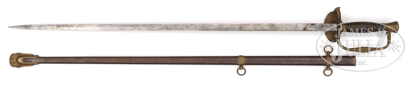 AMERICAN MODEL 1860 STAFF AND FIELD OFFICERS SWORD FOR MILITIA.30″ double edge blade; unmarked. Steel scabbard with brass mounts. Sword exhibits 3″ lozenge guard decorated with eagle over panoply of arms. Dyed shark skin grip with twisted wire wrap. Circa 1875. SIZE: 37″ overall. CONDITION: Sword is very good overall and all orig. 9-93462 (200-400) – Lot 2300