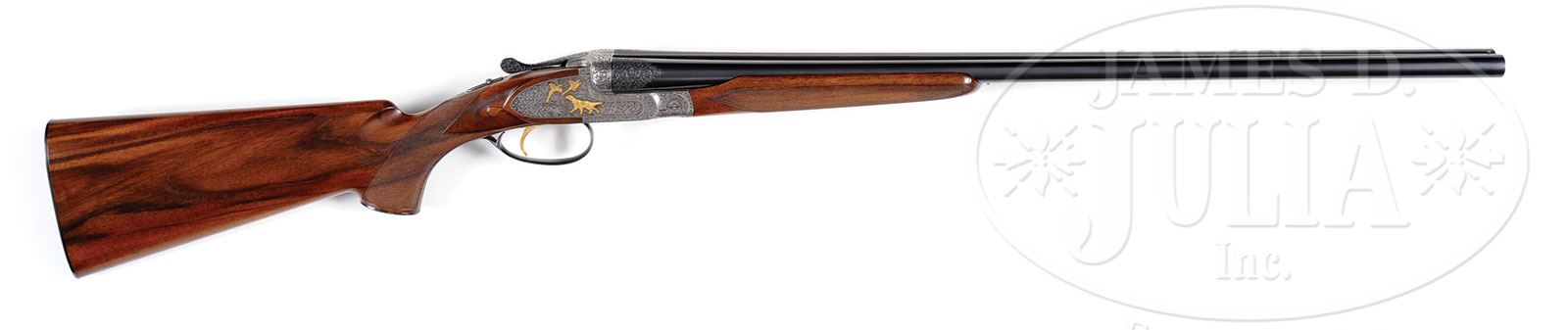 *NICELY ENGRAVED AND GOLD INLAID 20 GAUGE PAUL JAEGER CUSTOM SIDEPLATED EJECTOR SINGLE TRIGGER GAME GUN.SN 54414. Cal. 20 ga. 2-3/4″ Chambers. 27″ Dovetailed bbls with narrow, matted game rib have 1-1/2″ triangles of scroll at breech ends. Bbl flats are stamped with Belgian nitro proofs, bottoms of bbls with SN, choke, and steel markings. Coin finished sideplated boxlock action features non-automatic safety (S gold inlaid), hidden third fastener, and gold-plated, non-selective single trigger. Action is engraved with exceptionally well cut and shaded semi-relief open scroll at nearly full coverage. This well cut scroll flanks vignettes of semi-relief, gold inlaid sporting scenes on lockplates; a trio of mallards rise from marsh on left, and a setter watches a pair of pheasant take flight in open woodlands, on right. On bottom of action a pair of bobwhite are flushing, surmounted by scrolled riband engraved “Paul Jaeger, Jenkintown, PA.”. Fences are nicely carved with large, full relief, shaded scroll, with smaller scroll as background. This fine scroll engraving extends to top lever, trigger guard, flat skeleton buttplate, and grip cap. Streaked European walnut pistol grip buttstock features drop points and point pattern checkering at grip. Matching large beavertail ejector forend has Anson release. Bore diameter: left-.622, right -.625. Bore restrictions: left -.014 (Mod), right -.007 (IC). Minimum wall thickness: left -.025, right -.022. Drop at heel: 2″, drop at comb: 1-3/8″. Weight: 6 lbs. 3 oz. LOP: 13-7/8″. PROVENANCE: William Hammond Collection. CONDITION: Excellent, near new, retaining nearly all its orig finishes in wood and metal, with only a few light handling marks, most noticeable on left side of buttstock. Bores are excellent. Action is tight. Ejectors are in time. Trigger works. A flashy small bore bird gun. It would cost over $50,000 to have this gun engraved and built today. 4-53646 MGM236 (4,000-6,000) – Lot 2300