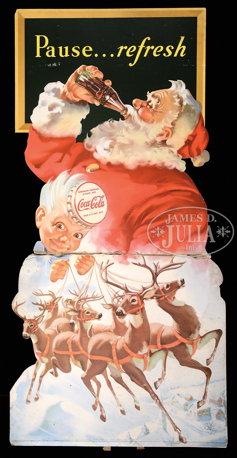 COKE CARDBOARD STAND-UP SANTA CLAUS.This was originally made to serve as a store window stand-up and had a built-in easel mount on reverse. It depicts Santa Claus enjoying a Coke while his reindeer pull the sleigh. Probably from the 1950s. SIZE: Approx 52″ h when opened x 22-1/2″ at its widest point. CONDITION: Piece is now separated at its fold seam and it has some creases in the Coke boy’s face. Otherwise generally good. 49103-12 (100-200) – Lot 2300 Auction: Advertising, Toy & Doll - Spring 2015 Please Note: All prices include the hammer price plus the buyer’s premium, which is paid by the buyer as part of the purchase price. The prices noted here after the auction are considered unofficial and do not become official until after the 46th day. |