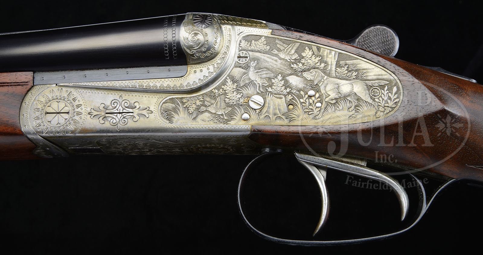 *20 GAUGE MERKEL MODEL 147 SL WITH ORIGINAL BOX.SN 780408. Cal. 20 ga. 3″ Chambers. 27″ Shoe lump bbls with raised, matted, concave rib are marked “SPECIAL – GEWEHRLAUFSTAHL” and with makers name along with “MADE IN GDR” on tops. Bbl flats are marked with 1982 nitro proofs for 3″ chambers. Coin finished sidelock action features automatic safety, Greener type crossbolt third fastener, side clips, raised rib tumbler end cocking indicators, and double triggers. Action is engraved with sprays of large shaded scroll. Trigger plate is marked with Suhl logo. Lockplates are semi-relief engraved with vignettes of dogs and game; a setter points a trio of fleeing quail in meadow on left, and a quattro of mallards erupt from marsh on right. Nicely marbled and figured European walnut straight grip buttstock measures 14-1/2″ over composition checkered buttplate. Point pattern checkering with line border is at grip. Matching splinter ejector forend has Deeley release. Bore diameter: left -.625, right -.622. Bore restrictions: left -.025 (Full), right -.012 (Mod). Drop at heel: 2-1/2″, drop at comb: 1-7/16″. Weight: 6 lbs 7 oz. LOP: 14-1/2″. Gun comes with its orig red, green, black, and yellow box with end label for this particular gun. CONDITION: Excellent, near new, with evidence of very little firing, and only a few minuscule marks on wood and finishes. Mechanically crisp. Box is excellent. Tape marks on end label. 4-51273 MGM54 (3,000-5,000) – Lot 2301