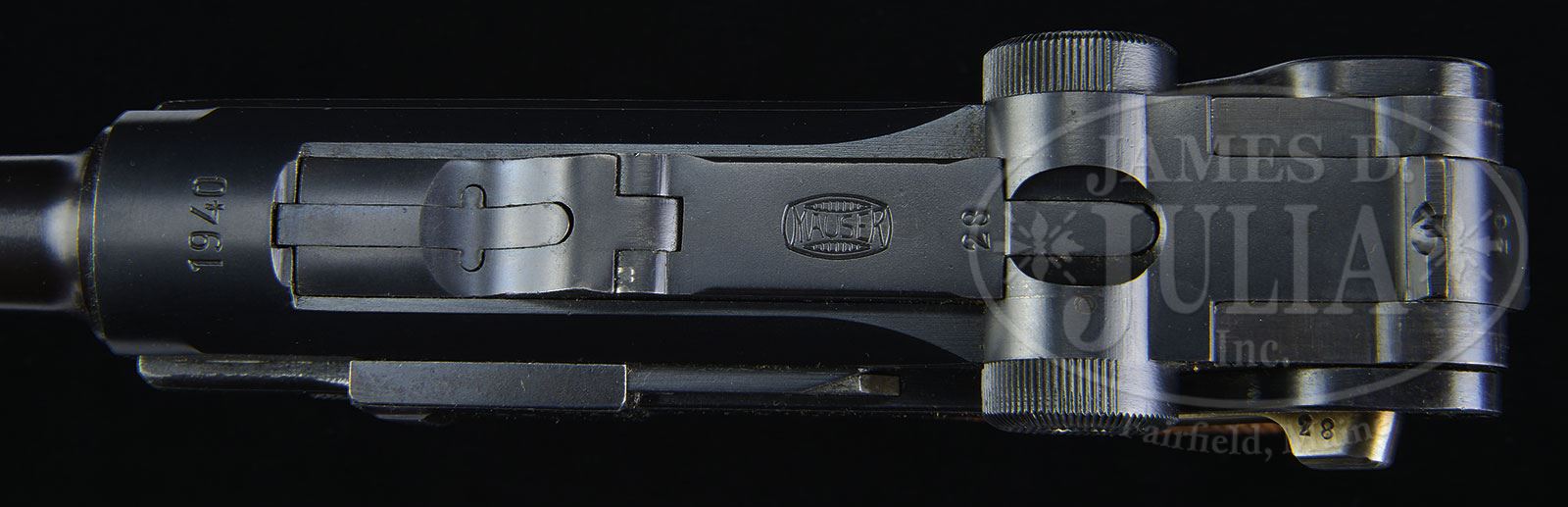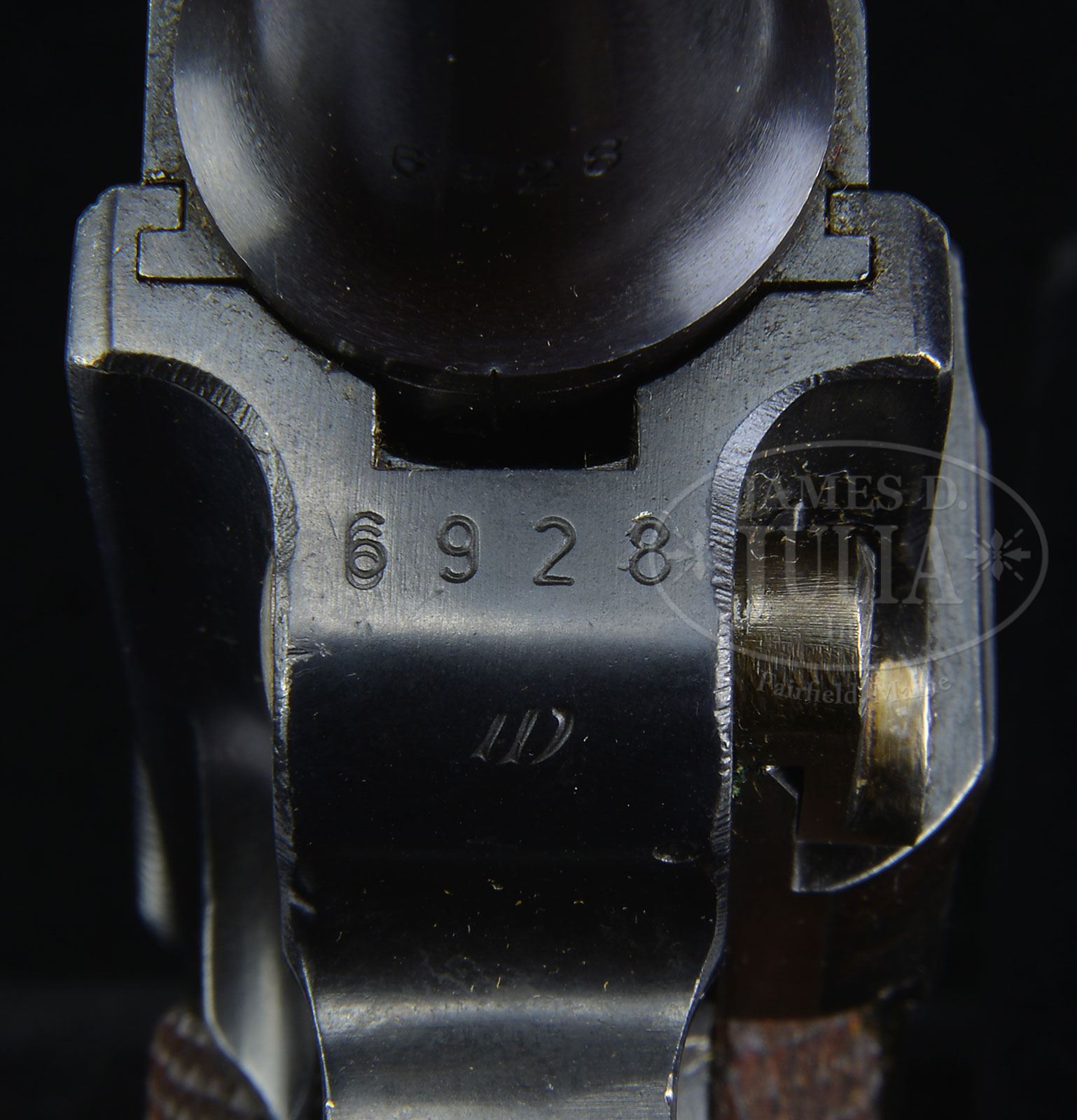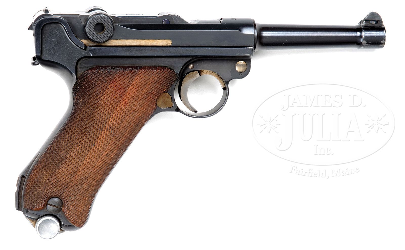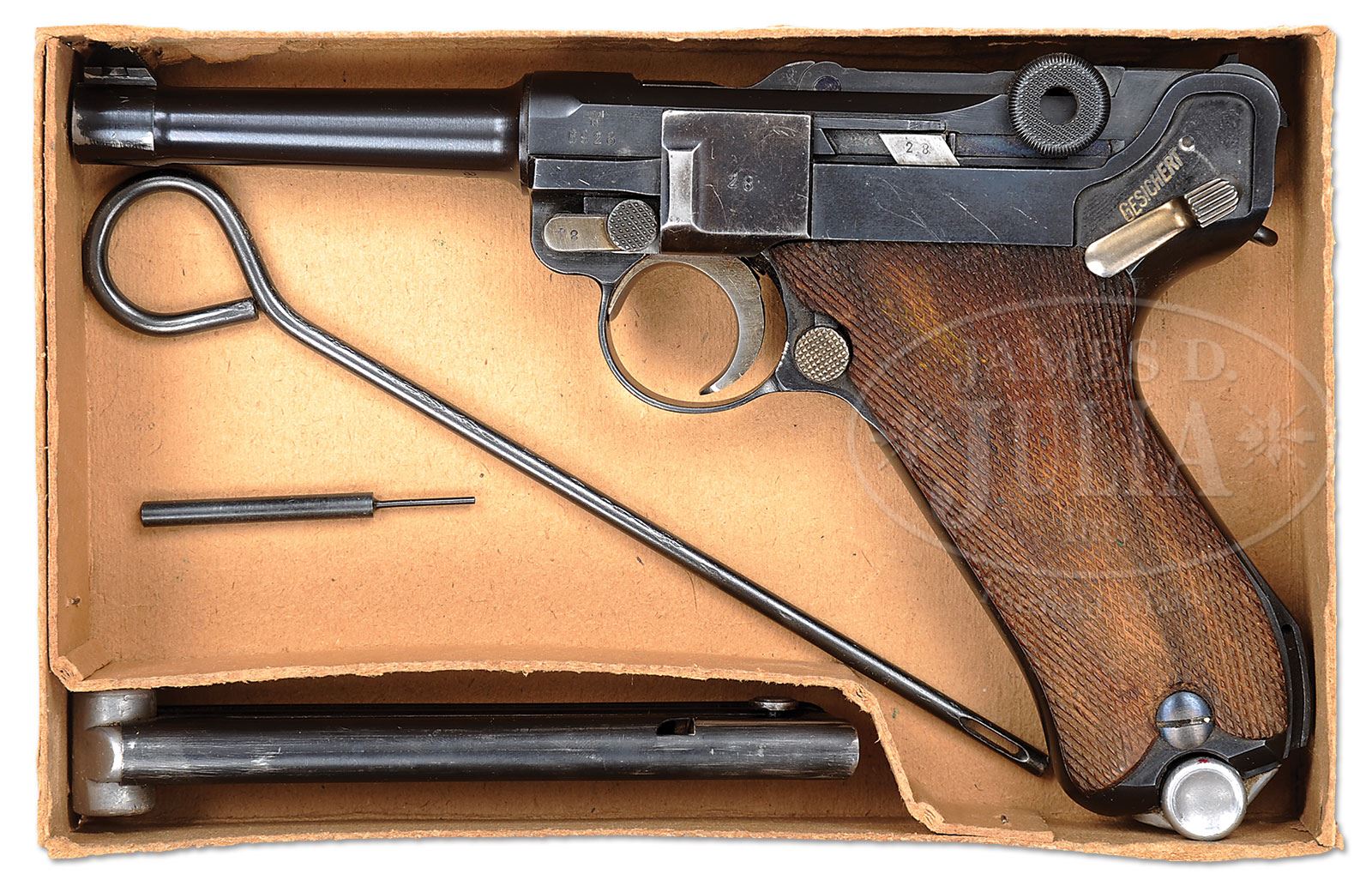 *◊ RARE SWEDISH 1940 MAUSER BANNER COMMERCIAL LUGER PISTOL IN ORIGINAL BOX.SN 6928w. Cal. 9mm 4″ bbl with Eagle/N proofs on front of sight base and SN on bottom. 1940 date above chamber. Mauser Banner on center toggle link. Eagle/N proofs on toggle assembly and left receiver. Unnumbered checkered walnut grips. All numbered parts on gun are matching including the original aluminum bottom magazine. In original plain cardboard carton with a separate magazine compartment that is secured with staples as are the corners. Included in the box are an original cleaning rod, pin punch and extra magazine that is the proper suffix letter but has numbers that do not match. Cardboard box lid has metal corner reinforcements and is marked “Cal. 9mm” in pencil on top. This gun is featured on pg 1438 of The Borchardt & Luger Automatic Pistols by Joachim Gortz & Dr. Geoffrey Sturgess. PROVENANCE: Collection of Dr. Geoffrey Sturgess. CONDITION: Very fine retaining 95% blue with unusual wear on grip straps. Straw is 90%. Grips are very lightly worn and retain original color with distinctive wood grain. Bore is bright with very light frosting. Magazines have very little wear. Mechanics are fine. Box is solid with minor scuffs and scrapes. Rod and punch are excellent. 4-52180 (5,000-9,500) – Lot 2301