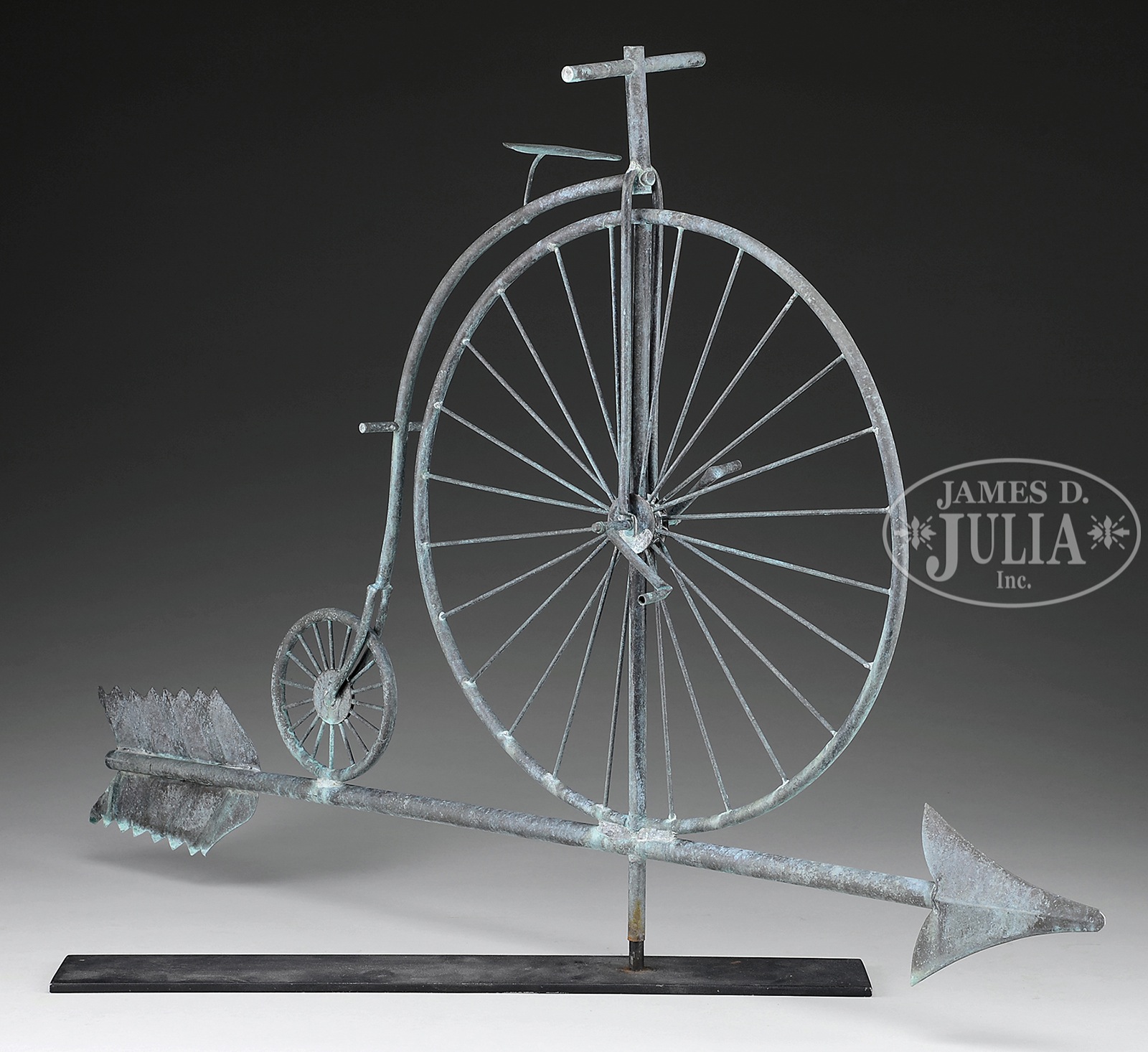 Description changed to Early 20th century, instead of 20th century. COPPER PENNY FARTHING BICYCLE WEATHERVANE.Early 20th century, American. Finely constructed from tubular copper, copper wire and sheet copper. Mounted on tubular and sheet copper arrow base. Offered without a museum stand. SIZE: 20″ h x 21″ l (bicycle) 33″ l (arrow). CONDITION: Very good. Fine uniform verdigris surface. 9-93721 (1,500-3,000) – Lot 2302