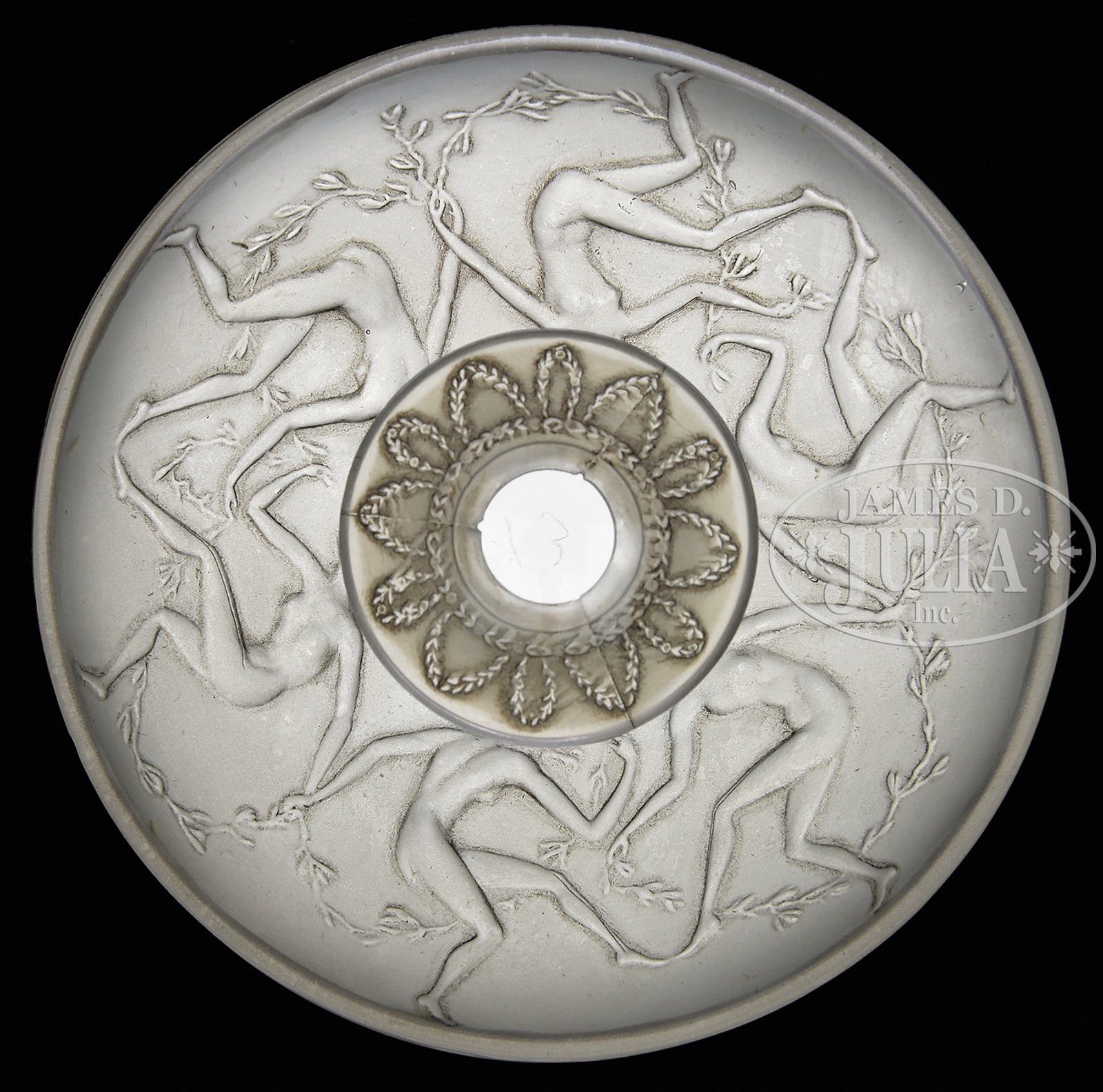 R. LALIQUE SIX DANSEUSES FLACON.R. Lalique flacon in the six danseuses design is decorated with 6 dancing nude females holding a garland that encircles the body of the bottle. The bottle is complete with original stopper. Signed on the underside with raised block letters “R. Lalique” and etched “France No 512”. Bottom of bottle and end of stopper are etched with number “73”. SIZE: 3-3/4″ dia. CONDITION: Very good to excellent. 5-68192 (15,000-25,000) – Lot 2302