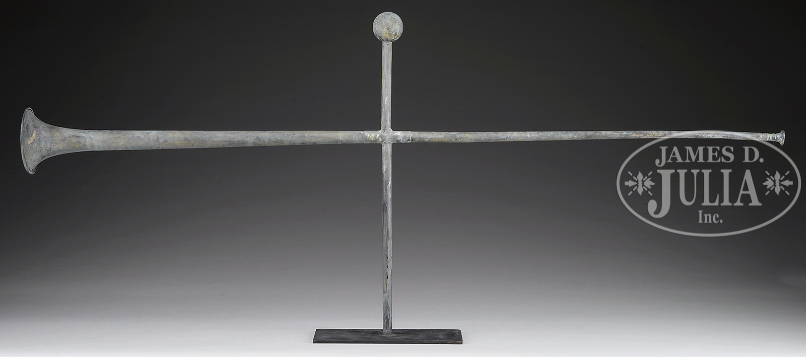 MOLDED AND CAST COPPER COACHING HORN WEATHERVANE.Late 19th century. Finely detailed and proportioned weathervane in the form of a coaching horn. Possibly made from an authentic coaching horn. Cast mouthpiece. Mounted on a museum stand. SIZE: 50″ l x 4-1/2″ diameter CONDITION: A couple very minor dents. Overall uniform partially gilt and verdigris surface. 9-93828 (1,000-2,000) – Lot 2303