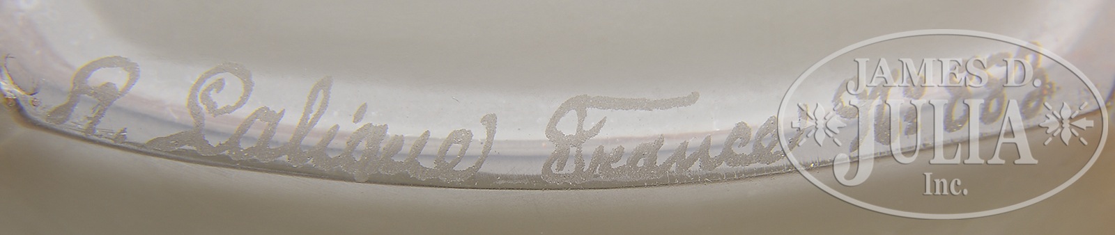 R. LALIQUE SIRENES AVEC BOUCHON FIGURINE STOPPERED VASE.R. Lalique stoppered vase in the Sirenes Avec Bouchon Figurine design is done in frosted glass with sides impressed with figures of nude sirens. Vase is finished with a figural stopper of a kneeling nude siren. The stopper and impressed sides are finished with sepia patination. Signed on the underside with etched signature “R. Lalique France No. 883”. This identical vase is pictured in the book R. Lalique by Felix Marcilhac, pg. 179. SIZE: 14″ t to top of stopper. CONDITION: Very good to excellent. 5-68543 (14,000-18,000) – Lot 2303