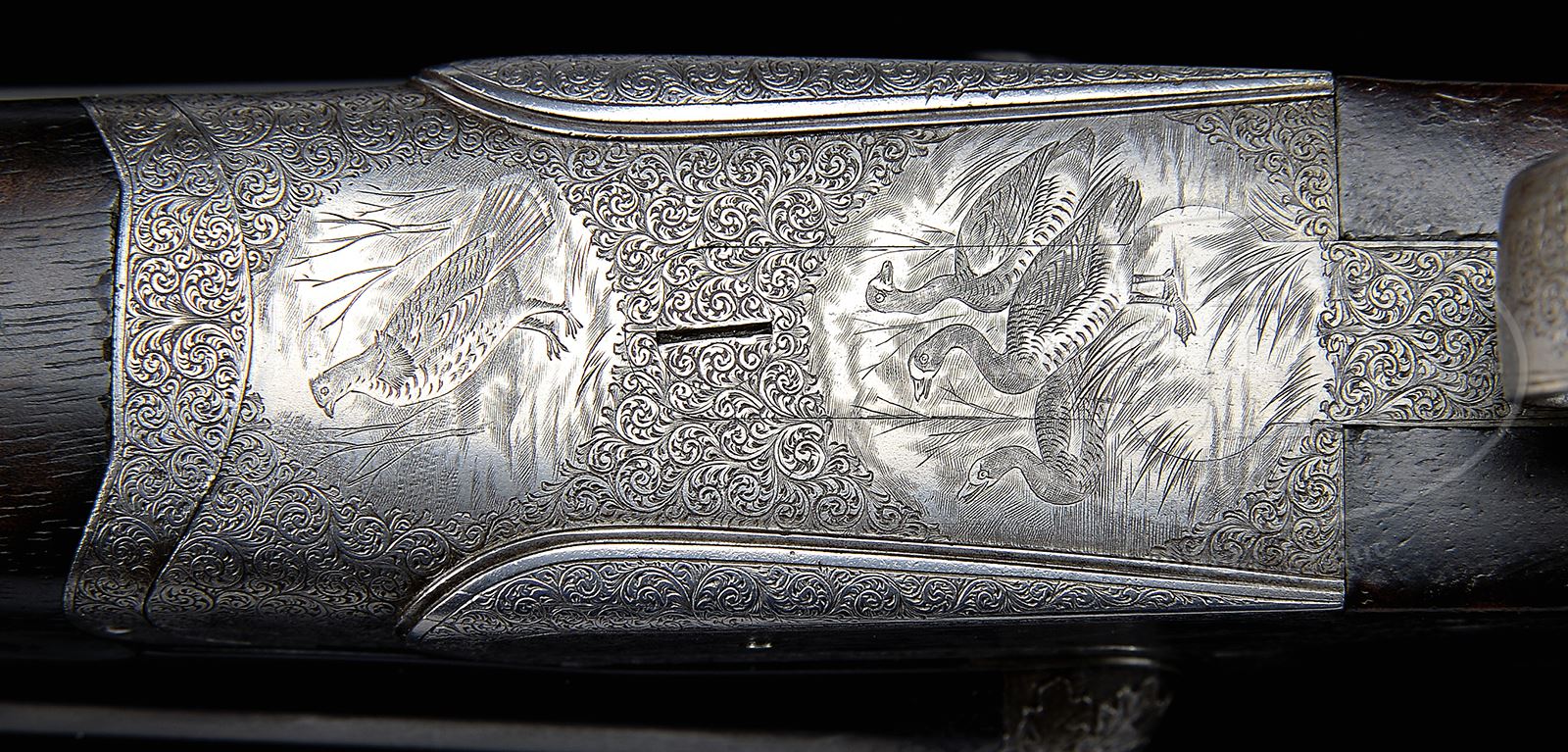 *BEAUTIFUL W.C. SCOTT PREMIER GRADE 16 GA.SN 75159. Cal. 16 Ga. 27″ bbls. 2-1/2″ chambers. Choked: IMP CYL/FULL. Full length lined rib with steel front bead. Water table marked “THE PREMIER GUN/W.C SCOTT & SON MAKERS”. Double triggers, automatic ejectors, automatic safety. 14″ LOP over orig lined horn buttplate, round pistol grip. Splinter forend. Receiver is beautifully and finely engraved with multiple game scenes on both side locks, full coverage scroll engraving throughout. Bottom of frame engraved with a large Ruffed Grouse surrounded by fine scroll and is scalloped. The gun also has side clips which are beautifully deeply engraved in an oak leaf pattern. Top lever and top tang fully scroll engraved, as is trigger guard tang and bow. Curtis style forend button and forend metal fully scroll engraved. Bbl wedges engraved in a light oak leaf pattern. The engraving on this gun could be studied for hours. Weight: 6 lb 2 oz. CONDITION: Very good. Bbls retain nearly all of a reblued finish with a few minor light exterior pits towards muzzle, breech engraving has been buffed. Receiver has turned gray, engraving still fairly sharp. Trigger guard is gray with no finish remaining. Checkering slightly worn. Nicely restored stock with numerous light dents and scratches, particularly on right side. Forend wood and checkering is good. Mechanics are fine, ejectors are slightly out of time but otherwise excellent. Bores have been cleaned with scattered frosting. This is really a beautiful high art Scott shotgun. 49272-1 JSL75 C&R (3,000-5,000) – Lot 2303