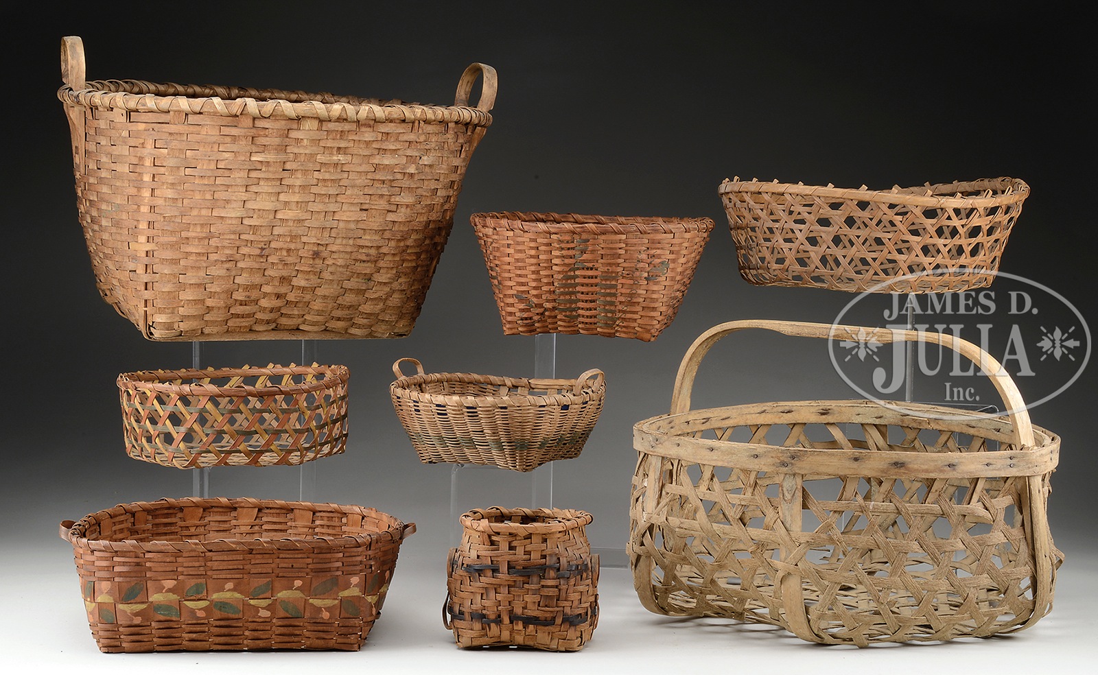 LOT OF EIGHT ANTIQUE BASKETS.Lot indcludes: 18″ dia. handled cheese basket (damage to side). 15″ dia. cheese basket. 10-1/2″ dia. cheese basket with painted stripe decoration in red, green and mustard. 11″ dia. handled basket with paint decoration in blue and green stripes (missing 3″ section of rim wrap). 13″ square 2 handled basket with strawberry vine paint decoration. 12″ dia. basket with round rim and square base having fanciful paint decoration. 6″ dia. small handled basket with square bottom, with black decorated stripes. 21-1/2″ large two handled basket, round top with square base (small breaks in bottom corners). SIZE: As noted above. CONDITION: As noted above. 49922-82, 49922-84, 49922-86, (800-1,200) – Lot 2307