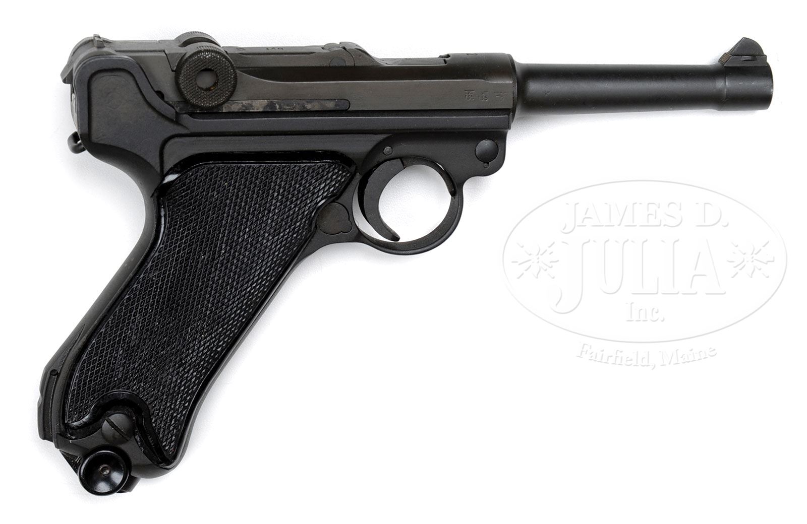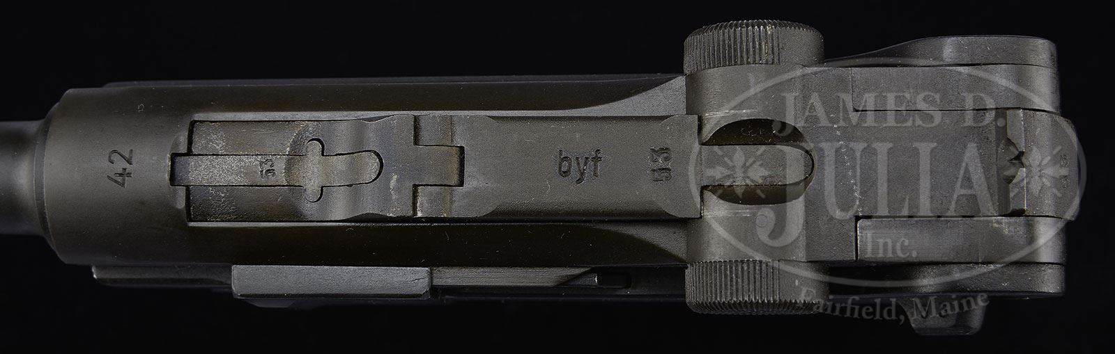 *◊ RARE MAUSER BYF 42 PORTUGUESE ISSUE m/943 LUGER PISTOL WITH PHOSPHATE FINISH.SN 253m. Cal. 9mm 4″ bbl with SN on bottom. 42 date above chamber “byf” (code for Mauser Manufacture) on center toggle link. Eagle/135 proofs on right receiver. Full Portuguese range SN on front of frame. All numbered parts on gun are matching except for the firing pin. Checkered black plastic grips with border and black plastic bottom fxo magazine. This gun is featured on pgs 790, 1087 of The Borchardt & Luger Automatic Pistols by Joachim Gortz & Dr. Geoffrey Sturgess. PROVENANCE: Collection of Dr. Geoffrey Sturgess. CONDITION: Fine retaining 98% Portuguese arsenal phosphate finish. Grips are sharp with some chips on checkering. Bore is bright and sharp. Magazine body retains 90% blue and there are no chips or cracks in plastic bottom. Mechanics are fine. 4-52869 (2,000-3,000) – Lot 2308
