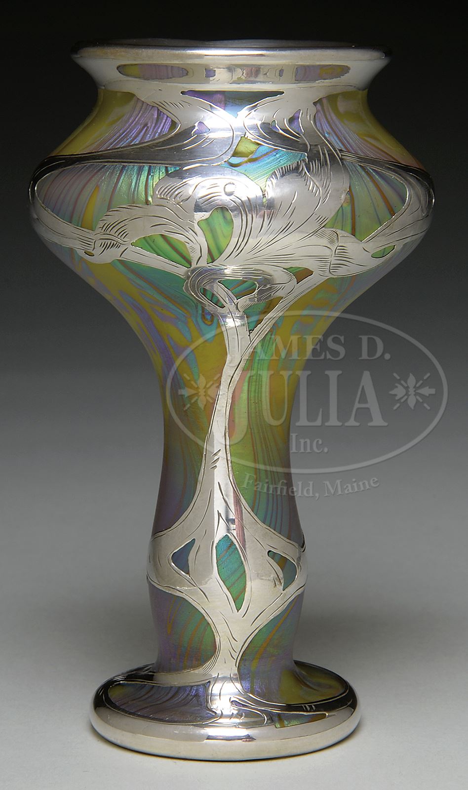 LOETZ SILVER OVERLAY DECORATED VASE.Loetz vase in Phaenomen Genre 1/158 has green iridescent flowing design against yellow glass background. Vase is further decorated with silver overlay Art Nouveau floral pattern surrounding body of vase. Unsigned. SIZE: 5-1/4″ t. CONDITION: Very good to excellent. 50357-3 (1,500-2,500) – Lot 2308