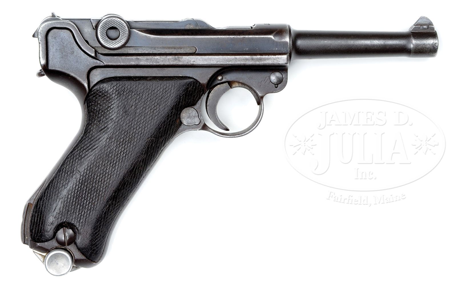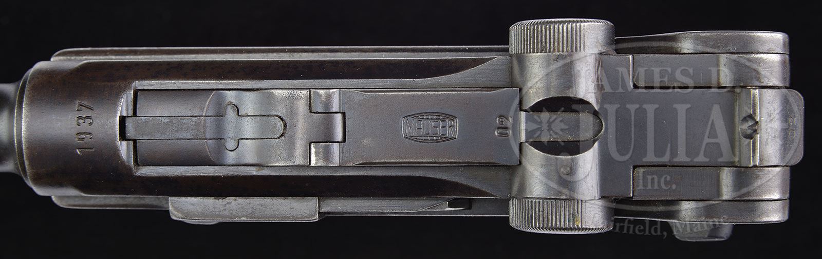 *◊ RARE 1937 MAUSER BANNER SIAMESE POLICE LUGER PISTOL.SN 4202v. Cal. 9mm 4″ bbl with horizontal Crown/U proof on front of sight base and SN on bottom. 1937 date above chamber. Mauser banner on center toggle link. Horizontal Crown/U proofs on toggle assembly and left receiver. Full -v range SN on front of frame. Numbered parts on gun are matching including the checkered walnut grips. Siamese proof and property number 330 in Siamese characters on back of frame. Aluminum bottom magazine has numbers that do not match. This gun is featured on pgs 539, 562 of The Borchardt & Luger Automatic Pistols by Joachim Gortz & Dr. Geoffrey Sturgess. PROVENANCE: Collection of Dr. Geoffrey Sturgess. CONDITION: Good retaining 30% blue with corrosion and light pitting overall. Grips are worn with a large chip gone from left grip under safety lever. Bore is worn with frosting. Magazine shows little wear other than scratches and minor dings on aluminum bottom. Mechanics are good. 4-52892 (1,500-2,500) – Lot 2309