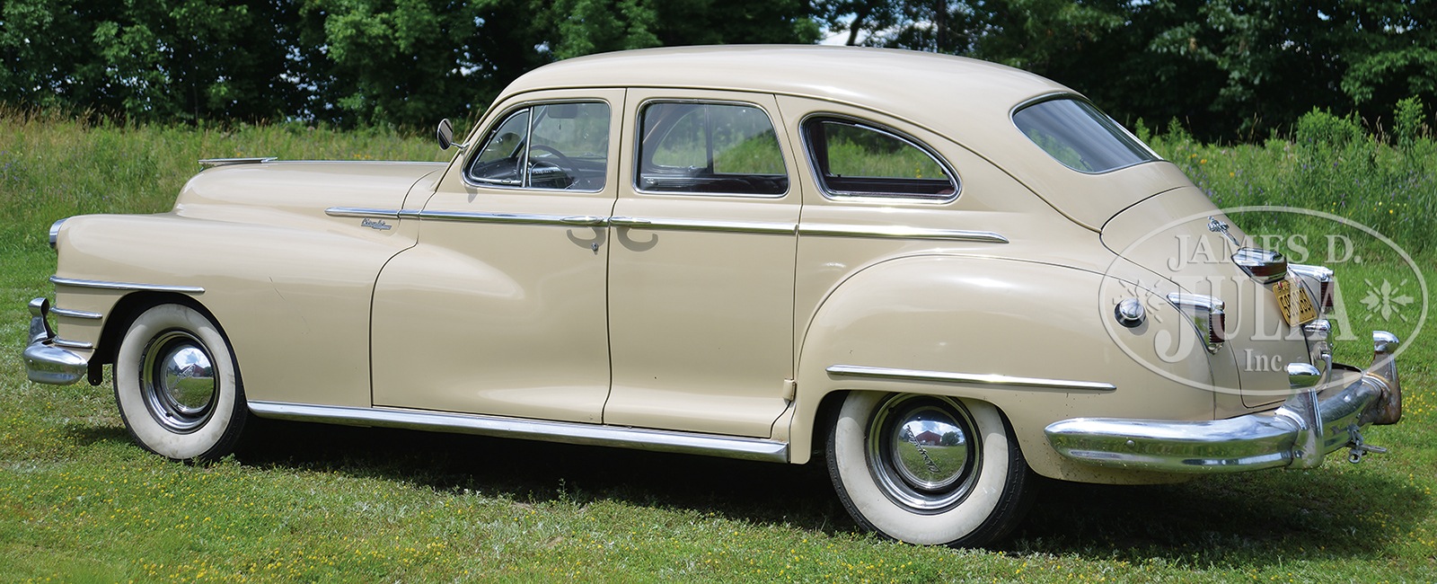 1948 CHRYSLER NEW YORKER 4 DOOR SEDAN.This car was purchased by John Cichocki in 1984 in southern California and they towed it back behind their motor-home to Norridgewock where it has resided ever since. John re-upholstered the seats and it still has the original V8 engine. The transmission was replaced in the mid ’80’s and the car was repainted tan about 20 years ago. For almost 30 years this car was used for family weddings and was featured on the cover of the book “Things That Last, a Memoir” by Betty Cichocki. It comes with a shop manual, its past registrations and other information regarding the car. Featuring fluid drive transmission (manual 1st & 2nd, automatic 3rd & 4th), suicide doors, bench seats and white wall tires. Odometer reading 21,256, VIN# 7063545. The manufacturers tag indicates: model 3925 9 15 5110408 body #31070. SIZE: 66″ h x 61″ d x 206″ l. PROVENANCE: The estate of John Cichocki, a professional upholsterer of Norridgewock, ME. CONDITION: Crack in passenger’s side window, minor scratches to paint, generally in very good condition. We encourage interested bidders to examine the car on their own or with the help of a professional. 9-93863 (12,000-18,000) – Lot 2310