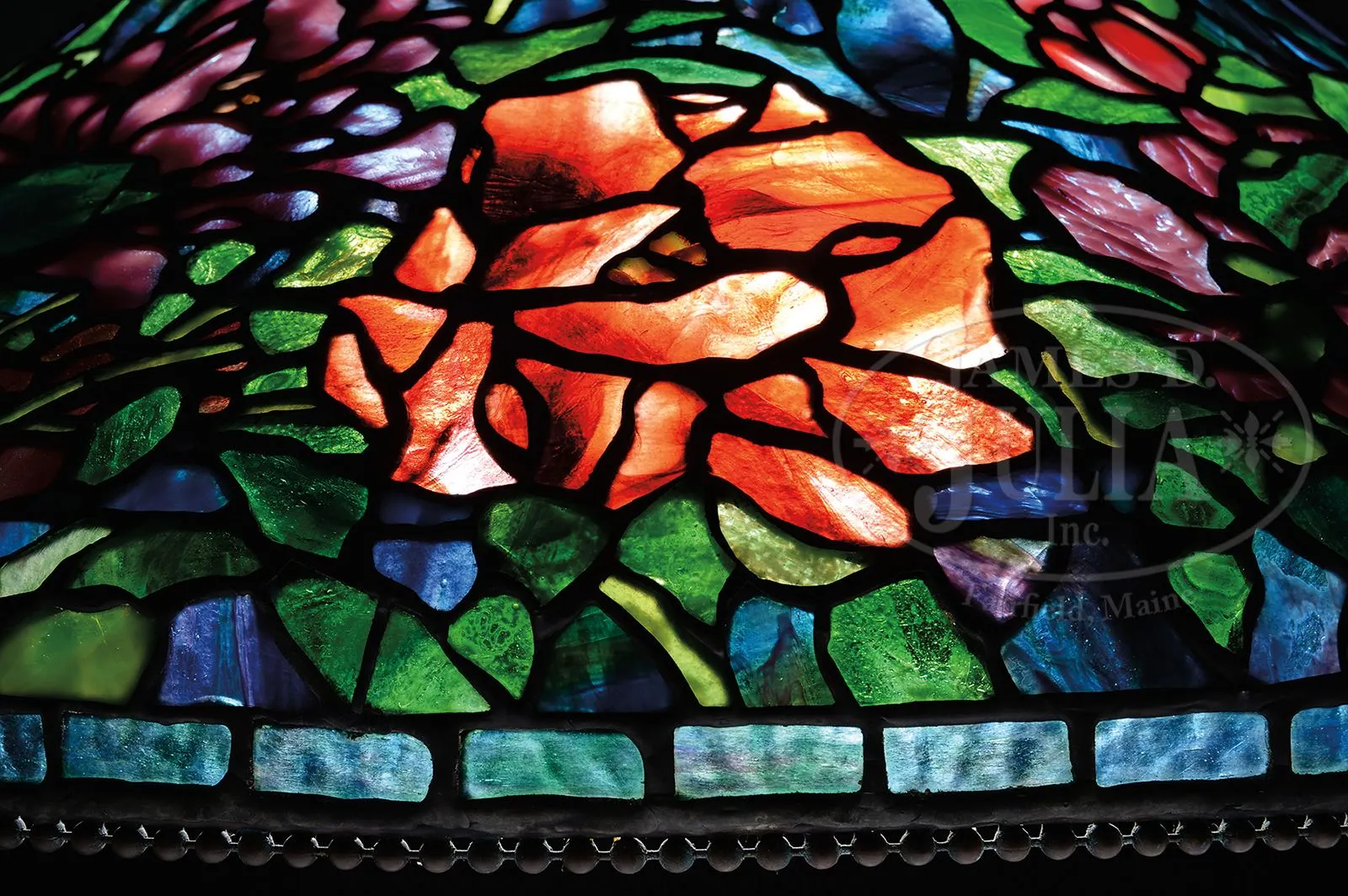 SOMERS STAINED GLASS PEONY TABLE LAMP.Massive contemporary stained glass table lamp by Somers Stained Glass Studio has rich red peonies with mottled green glass leaves, all set against rich shaded blue and green glass background. Large shade is finished with beaded border on lower rim. Signed on interior rim with applied tag “Original Somers Stained Glass Deer Park N.Y.” Shade rests on a contemporary adjustable cast bronze base with root and ball foot leading to adjustable stem and three-light cluster. Base is complete with pierced heat cap and is finished in deep brown patina. Base is unsigned. SIZE: Shade is 28″ dia. Lamp adjusts from 33″ to 37″ t. CONDITION: Shade is very good to excellent. Base is very good to excellent. 50515-2 (8,000-12,000) – Lot 2311