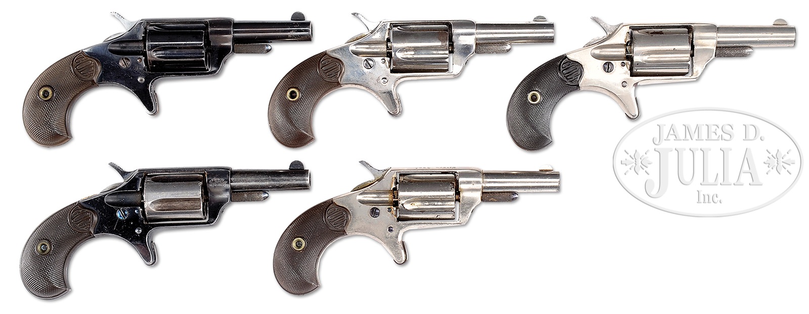 LOT OF FIVE COLT NEW LINE 2ND MODEL REVOLVERS.1) COLT NEW LINE. SN 21284. Cal. 32 CF. 2-1/4″ bbl with semi-circular front sight. 2nd model revolver having 5 shot long flute cyl. Full blue finish. 2-pc checkered hard rubber birdshead grips. PROVENANCE: The Dr. Robert G. Cox Estate Collection. CONDITION: Fine. Over 90% bright orig blue. Grips show light wear. Sound mechanics. Very good bore. 2) COLT NEW LINE. SN 16446. Cal. 32 RF. 2-1/4″ bbl with etched panel cal marking. 2nd model having 5 shot long flute cyl. Full nickel finish. 2-pc checkered hard rubber birdshead grips. PROVENANCE: The Dr. Robert G. Cox Estate Collection. CONDITION: Fine. 95% nickel. Good etched panel marking. Cyl pin head has some flattened checkering. Grips have spots of checkering wear. Good mechanics. Bore has some light pitting. 3) COLT NEW LINE. SN 13688. Cal. 32 CF. Bbl is 2-1/4″ with etched panel cal marking. 2nd model having 5 shot long flute cyl. Full nickel finish. 2-pc checkered hard rubber birdshead grips. PROVENANCE: The Dr. Robert G. Cox Estate Collection. CONDITION: Good. 70% nickel finish showing good etched panel marking. Grips show moderate wear. Action is out of time. Good bore. 4) COLT NEW LINE. SN 21486. Cal. 32 CF. 2-1/4″ bbl. 2nd model having 5 shot long flute cyl. Top of frame behind hammer has gold monogram “NE”. Right side front of frame has French retailer marking “P. WEILBtf / Paris / 35 PgfCHOISEUL”. Blue finish. 2-pc checkered hard rubber birdshead grips. PROVENANCE: The Dr. Robert G. Cox Estate Collection. CONDITION: Fine. 60% blue. Grips show moderate wear. Good mechanics. Bore shows spots of pitting. 5) COLT NEW LINE. SN 17444. Cal. 32 CF. 2-1/4″ bbl with etched panel cal marking. 2nd model having 5 round long flute cyl. Full nickel finish. 2-pc checkered hard rubber birdshead grips. PROVENANCE: The Dr. Robert G. Cox Estate Collection. CONDITION: Fine. 80% nickel finish with numerous scratches. Good etched panel marking. Grips show light wear. Good mechanics. Good bore. 50582-21, 50582-22, 50582-23, 50582-24, 50582-28 (2,500-3,500) – Lot 2311 Click here to view provenance