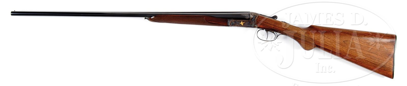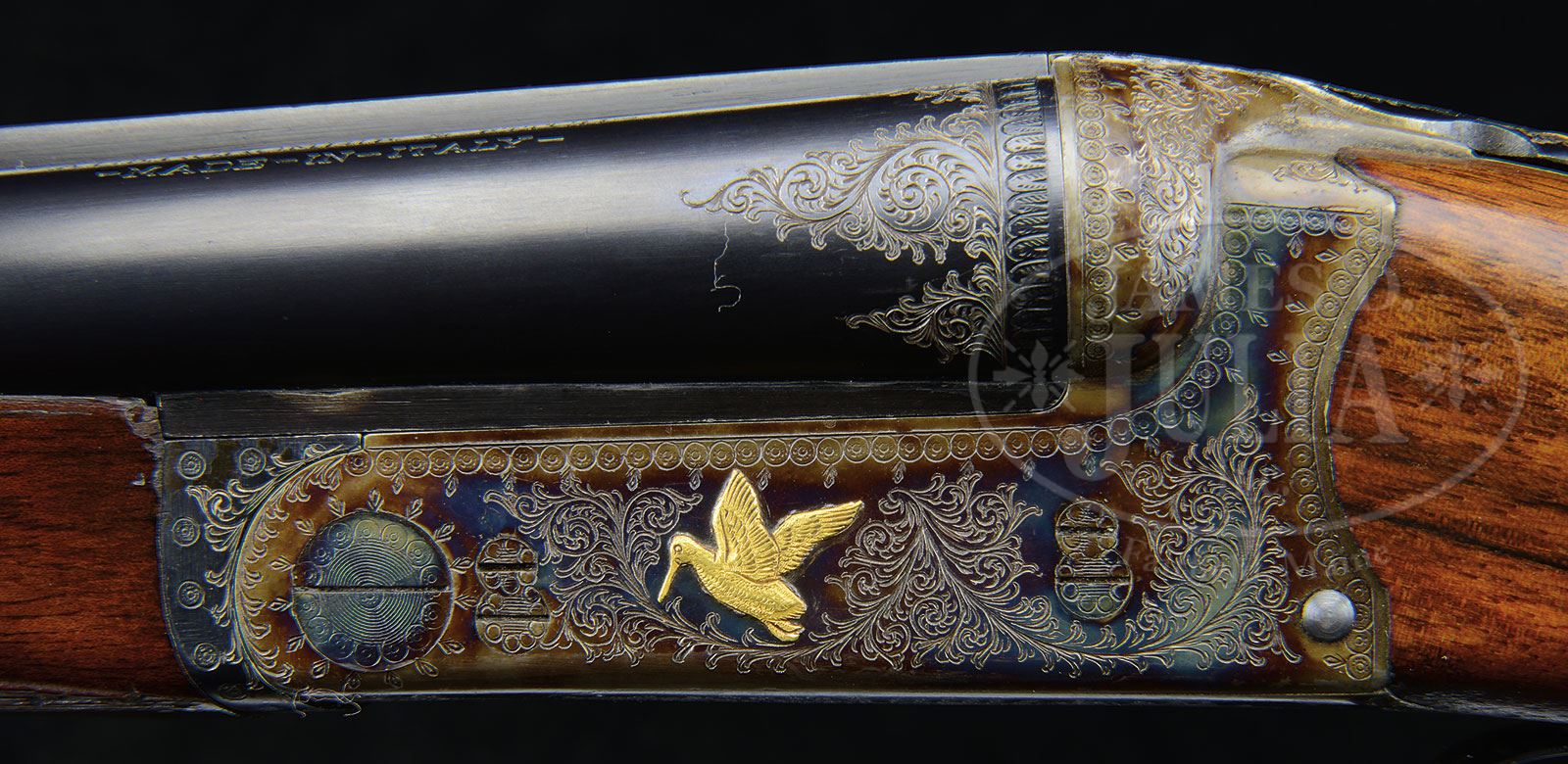 *.410 A & F ZOLI/ RIZZINI GOLD INLAID BOXLOCK GAME GUN.SN 5009. Cal. .410. 3″ Chambers. 26″ Bbls with raised matted rib, are marked “ABERCROMBIE & FITCH” and “MADE – IN – ITALY” on top of left bbl. There are small triangles of well cut scroll engraving on breech ends. Bbl flats are stamped with 1967 Italian nitro proofs, SN, and “ZOLI Flli RIZZINI MAGNO v.t. ITALY”. Choke stars are on bottoms of bbls. Diminutive case hardened boxlock action is marked with makers name and SN on water table, and features automatic safety, gas vents on breechface, and double triggers. Action is engraved with 70% coverage well cut scroll, as background for relief gold inlaid game birds; flying snipe on left, quail on right, and pheasant on bottom of action. A & F logo is gold inlaid on blued top lever, and a flying snipe is on trigger guard bow. SN is on tang. Lightly streaked European walnut round knob pistol grip buttstock measures 14-1/4″ over checkered composition buttplate. Point pattern checkering with line border is at grip. A vacant gold oval is on toe line. Matching long semi-beavertail forend has Anson release. Bore diameters at muzzles: left-.392, right -.401. Minimum wall thickness: left -.058, right -.054. Drop at heel: 2-3/8″, drop at comb: 1-1/2″. Weight: 5 lbs. 4 oz. LOP: 14-1/4″. CONDITION: Excellent, near new. Bbls retain approx 95% orig blue with only the slightest silvering evident at muzzles. Action retains nearly all of its vivid case hardening color. Stocks retain 98% + orig finish with a few minor handling marks. Bores are excellent. Action is tight. A fine handling nicely appointed little gun. 4-51359 MGM103 (4,000-6,000) – Lot 2313