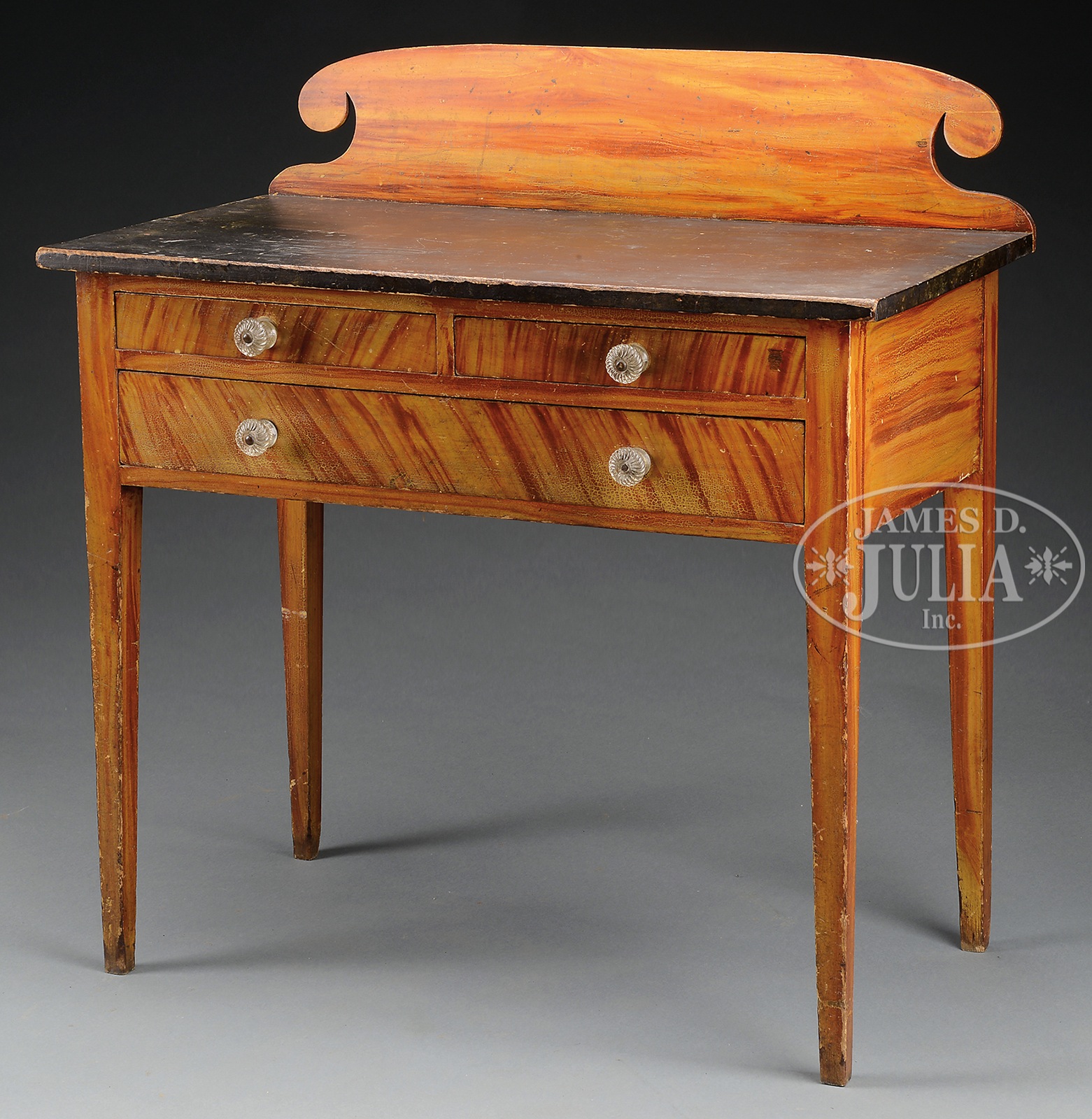 RARE SHERATON GRAIN PAINTED DRESSING TABLE.Circa 1840, probably Maine. Rectangular table with shaped splash guard with rolled ears joined to the rectangular top in green paint over two graduated long drawers raised on square tapered legs. SIZE: 38″ overall h. 36-1/2″ tabletop h. x 36″ w x 19″ d. CONDITION: Splash guard slightly warped with repair to ear. Original turned glass knobs simulated graining remains intact. Good overall. 49922-7 (800-1,200) – Lot 2313